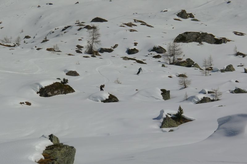 Hier ein Foto von einer sehr schönen entspannenden Abfahrt fern der Pisten auf der Ayaser Seite. Oben vom Colle Sarezza nach Süden gequert - ein paar Minuten Fußmarsch über einen schneefreien Weg eingeschlossen - und dann in weitem Bogen im Tal und am Gegenhang bis zum Beginn der Piste nach Champluc zurück. Der Schnee war am Nachmittag herrlich firnig.