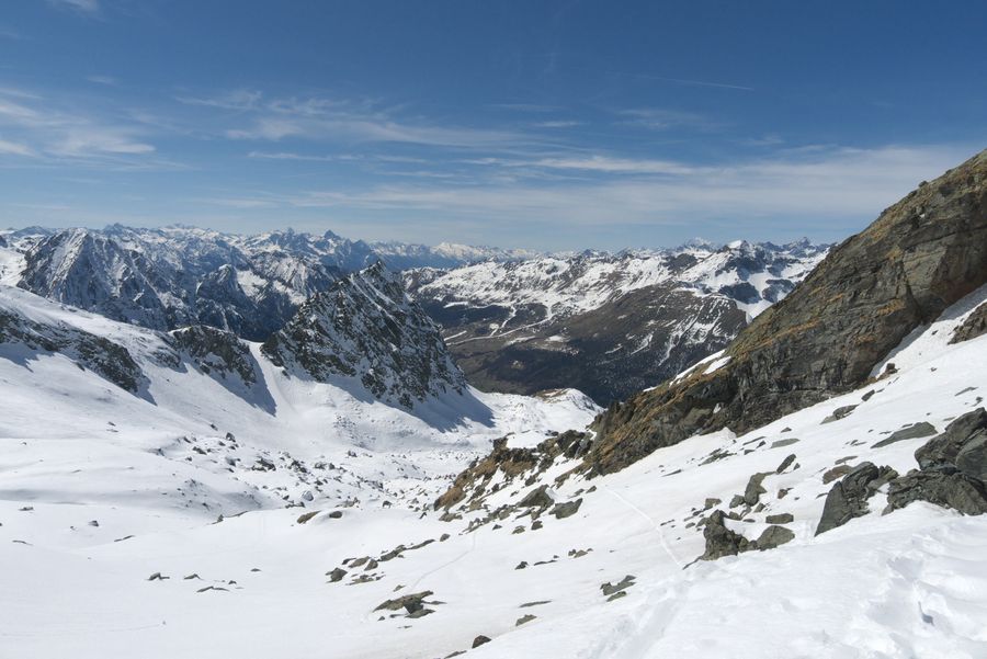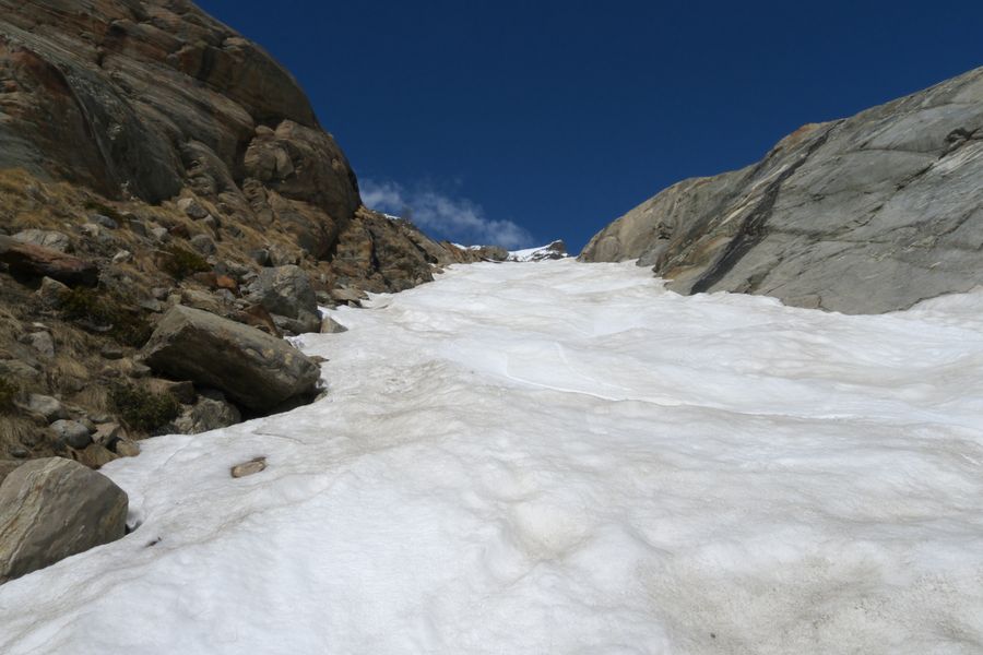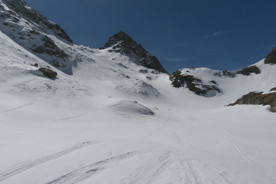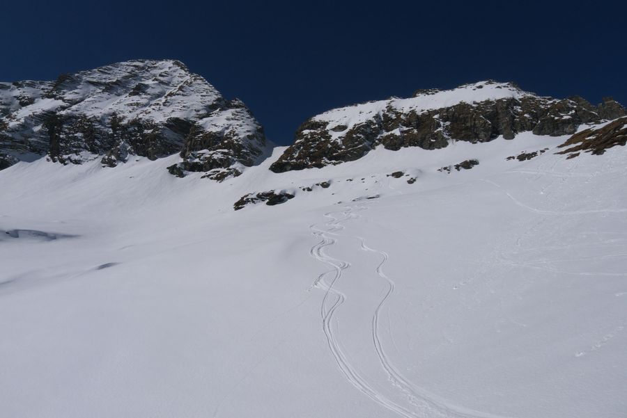 Und über den recht schneearmen Canale Miniere zurück zur Balma. Diesen Canale habe ich vor Jahren schon viel schöner erlebt. Auf der gegenüberliegenden Schattseite hielt sich noch lockerer Pulver.