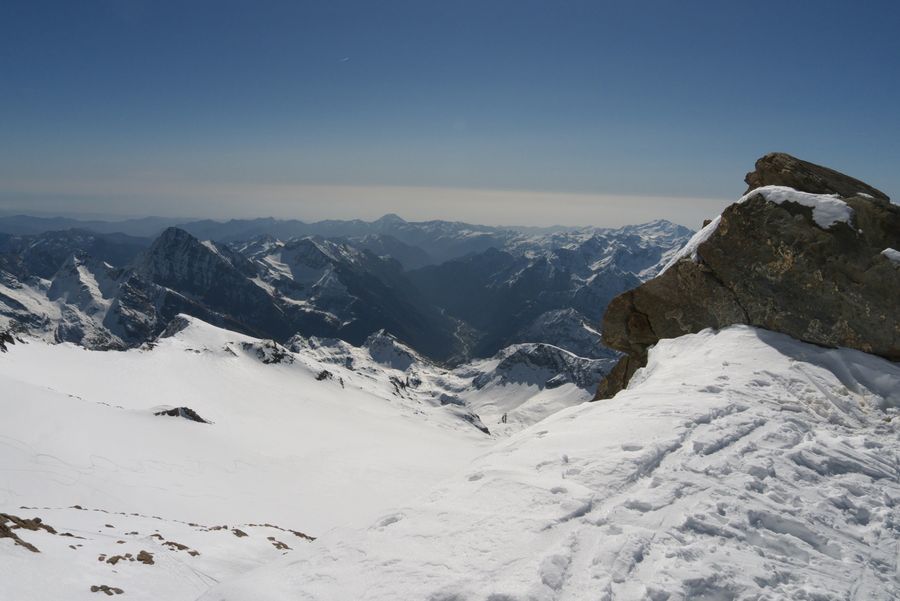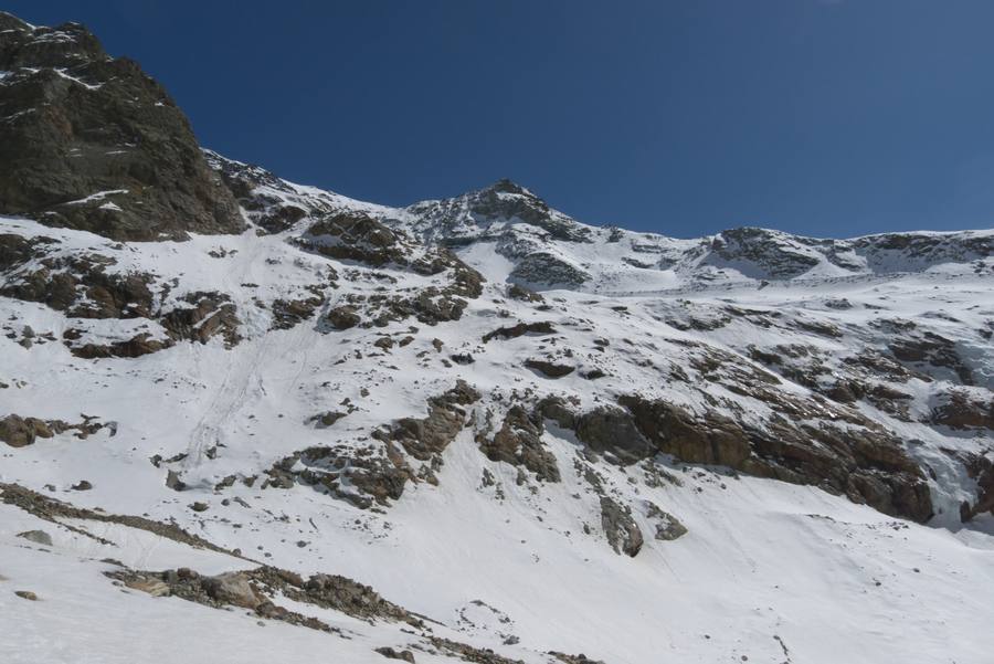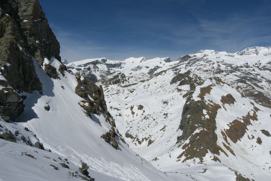 Das nächste Foto ist im Valle d’Otro vor einer kurzen Querung zum Canale Giachetti - viel Schnee und bester Firn. Der Canale selbst war sehr ausgefahren und am Morgen hart, dazu ein bischen Steinschlag. War letztes Jahr wesentlich besser, aber dafür waren diesmal die Hänge vor dem Canale viel schöner zu fahren.