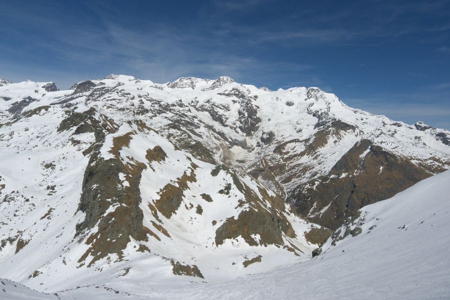 Halblinks ist für mich eine der schönsten Pisten von Monterosa-Ski zu sehen. Vom Colle Sarezza nach Norden zunächst ziemlich eng und recht steil. Am Ende des schönen Pistenhanges die Felle aufgezogen und gemütlich zum Kamm aufgestiegen, Richtung Rothorn. Hier runter fahren wäre schön bei herrlichem Firn...