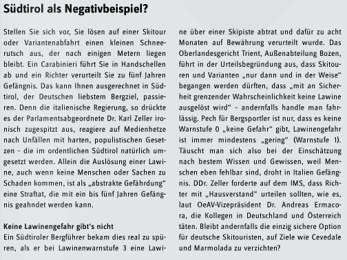 auf der einen seite, wird sich die situation, abseits der pisten, durch den angelaufenen freeride boom, die nächsten jahre noch verschärfen. auf der anderen seite, waren verbote dieser art noch nie wirklich hilfreich, eher im gegenteil. leute, die sich derzeit unangemessen im gelände bewegen, werden sich auch von einem quasi verbot nicht abhalten lassen.