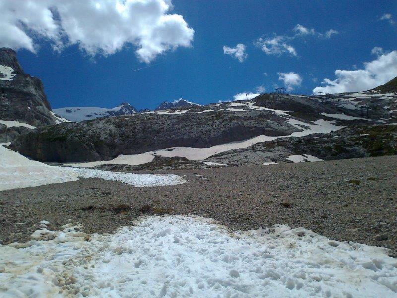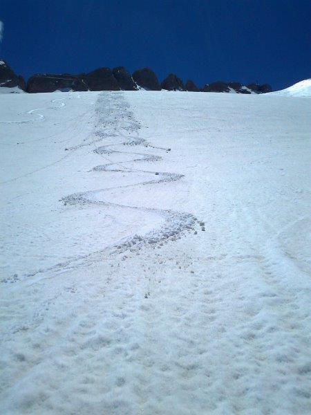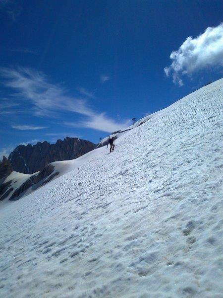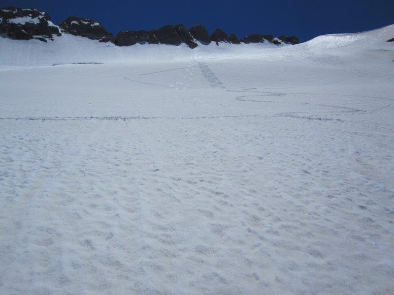 Der Aufstieg über den Gletscher zur Punta Rocca war völlig problemlos. Die Schneemengen sind gewaltig: Trotz der sommerlichen Witterung Mitte Juni hatte die "Sahara-Grenze" den Gletscher noch nicht erreicht. An den Gletscherspalten nahe der Punta Rocca konnte man gut sehen, dass die Saharaschicht vom 19.2. noch fast einen Meter unter der Schneeoberfläche liegt; darunter liegen ja dann die meterdicken Schichten der Starkschneefälle der Weihnachtstage und des "tsunami di neve" Ende Januar.