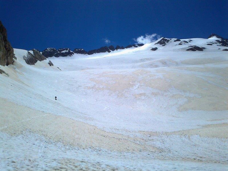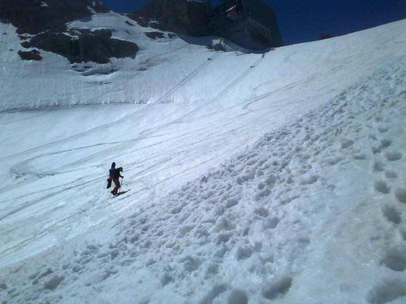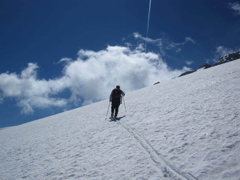 Jetzt, Mitte August, als ich endlich zum Schreiben dieses Berichtes komme, kann man absehen, dass unser Ausflug an einem der wärmsten Tage dieses Sommers am Gletscher stattfand. Der Schnee war bereits früh aufgefirnt und gerade gut zum Laufen mit Bergschuhen bzw. Tourenski. Entsprechend schweißtreibend stellte sich der Aufstieg heraus.