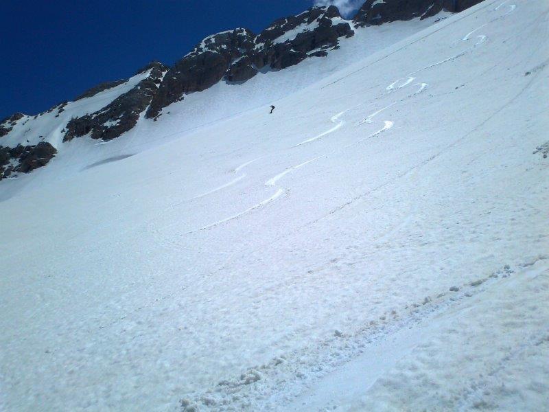 Nach einer ausgiebigen Mittagsrast ging's dann in butterweichem Firn über 1200Hm bis zum Stausee runter. Lediglich am Ende musste man zweimal 10m abschnallen, ansonsten kam man durchgehend bis zur Blumenwiese am Parkplatz runter. Die Nachmittagswärme von 20 Grad am Stausee hatte noch einen besonderen Vorteil... der saharabedingte Eierkartonschnee ((c)by starli