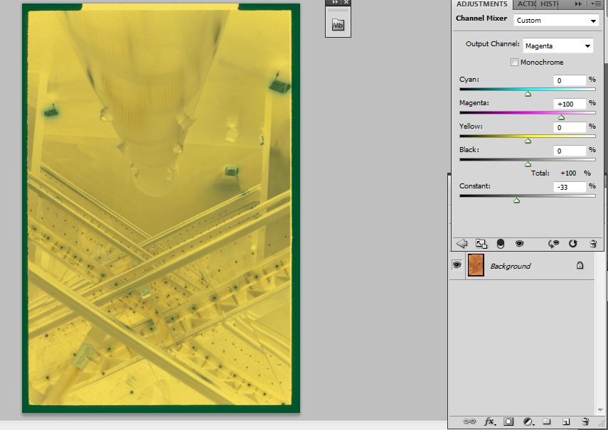 The procedure to remove a magenta mask is basically the same as above for an orange mask, with the exception that that the Yellow channel in CMY remains AS IS, and the constant in the Magenta Channel only needs to be reduced by 25%.