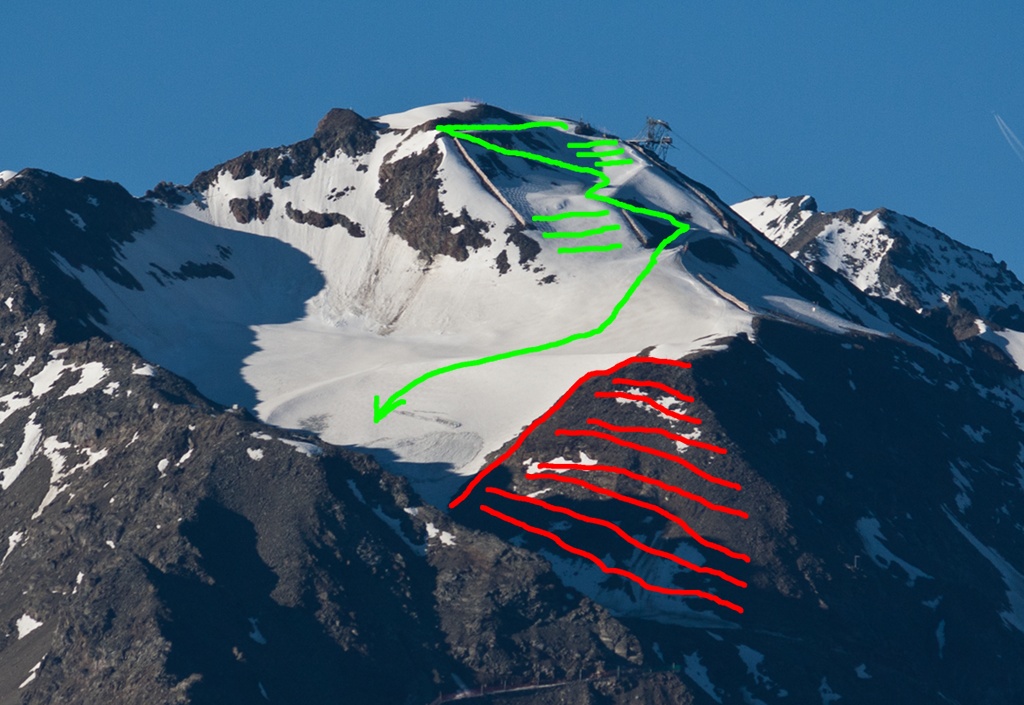 - wahnsinnig intensiv können die dort nicht beschneit haben, wenn die Piste bereits Anfang Juli nicht mehr zum Pass herunter reicht (siehe Mölltal, und dort ist es Südhang). Oder fällt am Mölltaler immer/dieses Jahr einfach viel mehr Schnee oder wirkt sich der Rest-Gletscher dort so verzögernd auf die Abschmelzung aus?