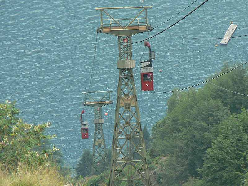 Oder ist das alles nur verdammt gute Menschenkenntnis?? Naja nichts destotrotz hoch nach Sighignola vorbei an 2 verrostete und vergammelten Skiliften. Irgend ein Italienisches Fabrikat. Keine Ahnung.... Wer weis was für eines?? Angeschrieben war Alpimpianti AG (Siehe Schild) Am eine Lift war schon das Seil demontiert. Neu war an der bergstation ein Zauberteppich sowie 2 Schneekanonen. Die Pistenmaschinen sahen nicht mehr Fahrbar aus. Zur Sighignola. Hier wurde 68 eine Luftseilbahn von Campione hoch gebaut. Da die Bahn durch 2 Länder geht mussten 2 Konzessionen geholt werden. Bei der Schweiz gings zu lange dann war die Gesellschaft konkurs bevor die Bahn fertiggestellt war. Und da steht sie jetzt im Rohbau seit fast 40 Jahren. Technik ist grösstenteils schon eingebaut. Ziemlich gespenstig da drin. Vor allem der tiefe Spannschacht. Die Stützen (Zumindest eine) steht auch schon und auf dem Dach liegt ein Pendelarm der Kabine. Weiter gings vorbei an vielen Bauruinen die nie Fertig gestellt wurden zum Monte Casle. Hier endete eine Standseilbahn auch stillgelegt. Allerdings wird die Bergstation mittlerweile renoviert. Vielleicht die Bahn auch erneuert? Hier in dieser Region hinter dem Monte Generoso gibt oder eher gab es diverse Skigebiete. Davon besteht ausser den Liften am Sighignola noch ein kurzer Tellerlift am Capanna Bruno zum Piz della Croce. Der Hauptlift untypisch für Italien, komplett demontiert. Auch die restlichen beiden Lifte waren Ratzpuz weg. Hersteller dieses Liftes ????? Zum Schluss gings noch nach Pigra. Knattert ganz schön durch die Engen Gassen. Dieser Ort wird seit 1948 von Argegno am Comersee mit einer 15er Pendelbahn erschlossen. zwar 1994 von Sacif erneuert, grösstenteils aber noch die alte Technik. Wer die Bahn ursprünglich gebaut hat?? Vielleicht C&T oder sowas. Kuruios sie besitzt kein verschlossenes Tragseil. Mit 3,40 Euro für eine Retourfahrt mit tollem Seeblick Preisgünstig. Bahn ist auch recht beliebt nur die Italienische einstellung zum Fahrplan naja. Wird da auch gestreikt??