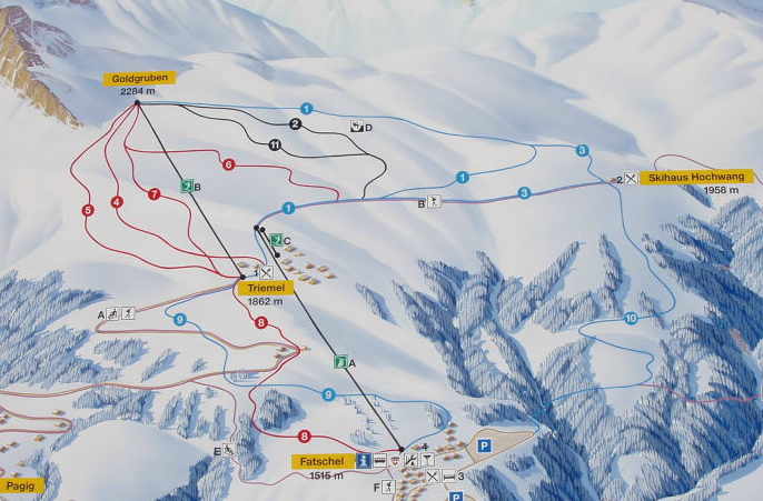 Wirklichen Plan habe ich nicht. In Splügen gab es natürlich nur Prospekte von der Ferienregion Viamala, nicht aber von anderen Skigebieten Graubündens. Im Skiatlas taucht Heinzenberg auch nicht auf und der Winterprospekt von Graubünden liegt daheim im Schrank. Ich weiß nur, dass es zwei nicht verbundene Skigebiete gibt, eines mit Sesselbahn und eines nur mit Schleppliften, eines mit vier Liften und eines mit zwei. In welcher Kombination weiß ich leider nicht mehr.