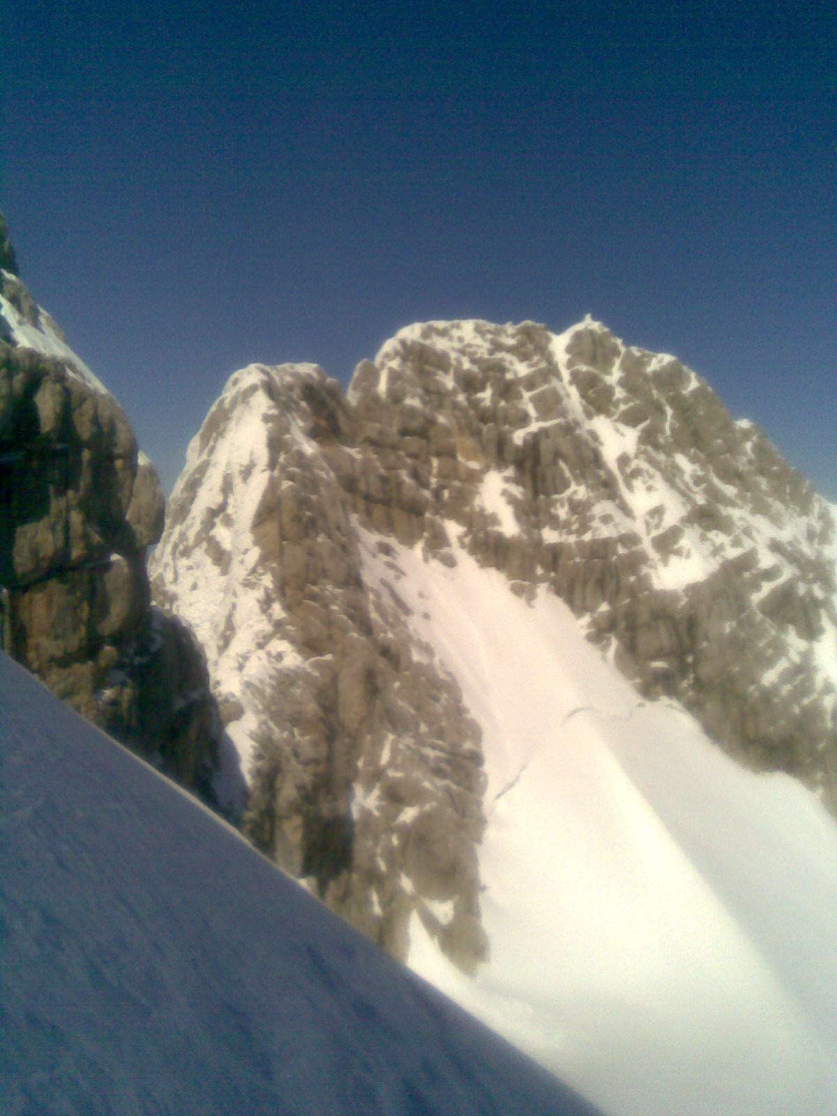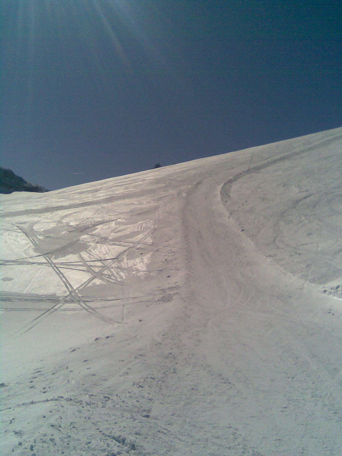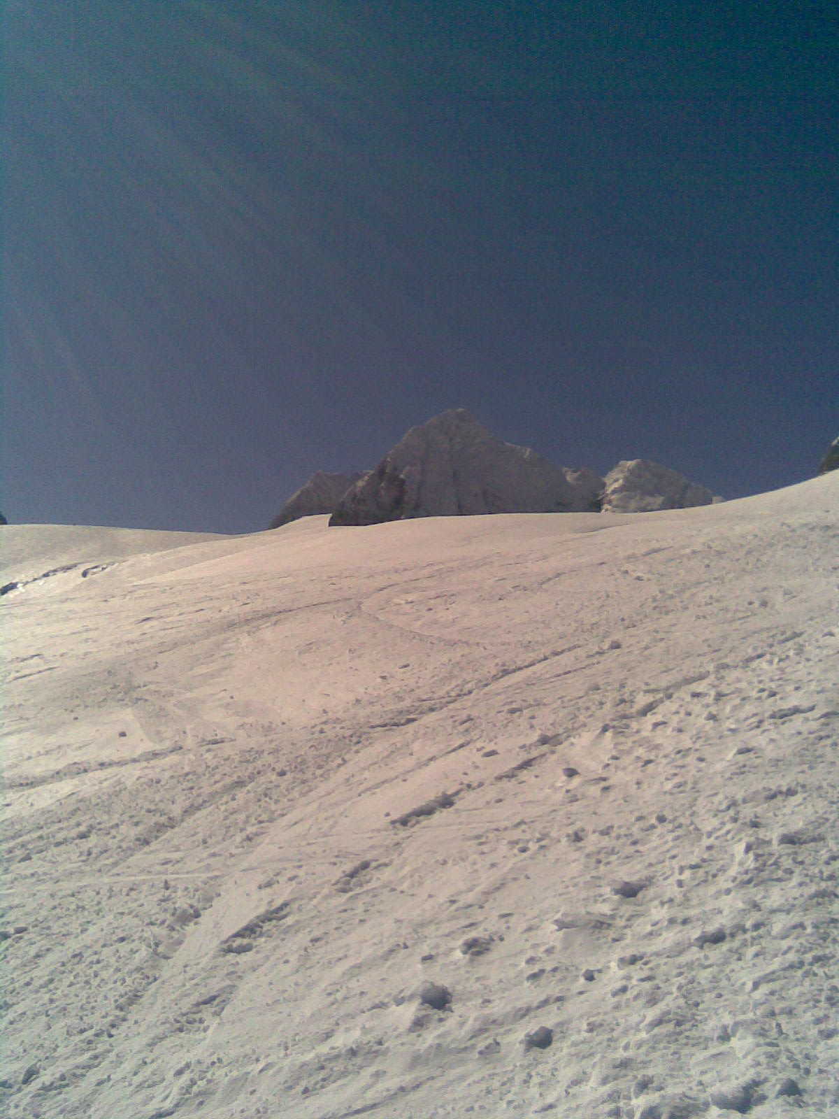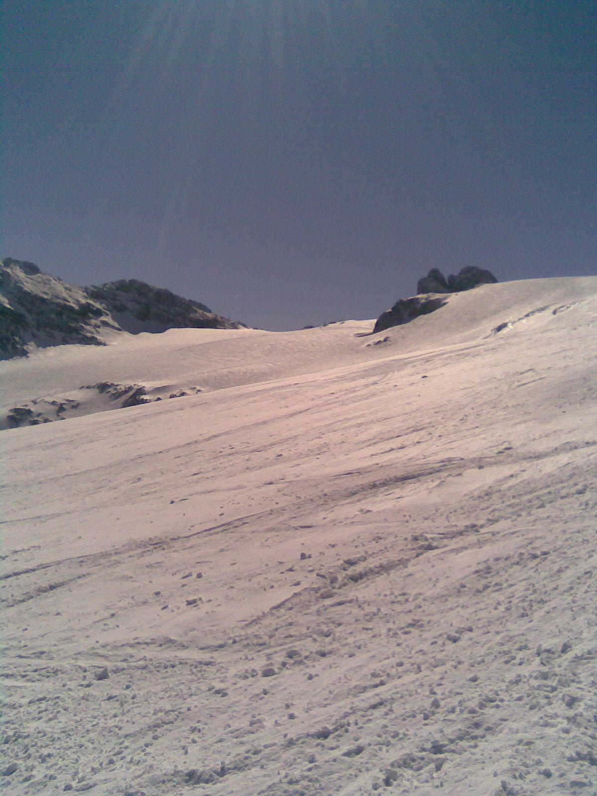 Dateikommentar: Endstation Sehnsucht. Oberhalb nur mehr Fels. Verdammt steil - der Nachbarhang verdeutlicht die Ausaperung und Steilheit dort oben.