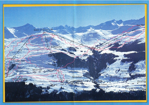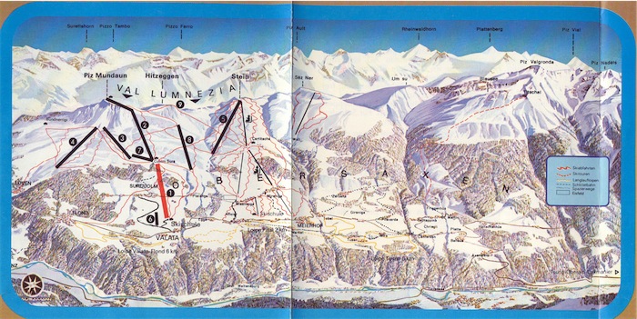 Hier noch ein paar ältere Aufnahmen von Obersaxen. Alle zwischen 1981 und 1989 entstanden - alle Fotos/Grafiken sind aus Prospekten entnommen und eingescannt. Interessant bei den Panoramen die damalige Zweiteilung des Skigebiets in die Piz_Mundaun-Hälfte und in die Obersaxen-Hälfte. zudem gab es 1983 noch keinen Verbindungssessel zwischen Wali und Stein. Und: man beachte den alten Sessel Meierhof-Kartitscha...