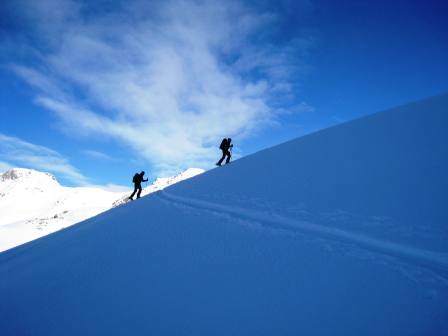 Am zweiten Tag haben wir uns für den Gipfel des 2797 Meter hohen Mot dal Gajer entschieden. Der Aufstieg liegt östlich ausgerichtet. Dies für uns umso wichtiger, da Tempereatur bis minus 20°C in diesem Tal keine Seltenheit sind. Ganz so kalt wurde es dann aber doch nicht (nur -15°C), aber die Bise blies ganz leicht und somit verwandelte sich das schattige Tal in eine Eiskammer. Nach einer Stunde erreichten wir aber die ersten Sonnenstrahlen, die wir gleich in uns aufsogen. Nach gut 3 Stunden erreichten wir den Gipfel und zu unserem Erstaunen waren wir an diesem Tag auch die einzigen. Im nachhinein auch gar nicht erstaunlich, da das einzige Hotel im Val S-Charl nur 36 Betten hat und davon mindestens die Hälfte Schneeschuhtouristen und andere Touristen sind. Auf dem windstillen Gipfel rasteten wir ausgiebig, betrachteten die umliegenden Gipfel und planten unsere Abfahrtsroute. Die Route ins Val Travü schien uns vielversprächende Hänge mit guten Schnee zu präsentieren und so war unsere Entscheidung schnell klar.