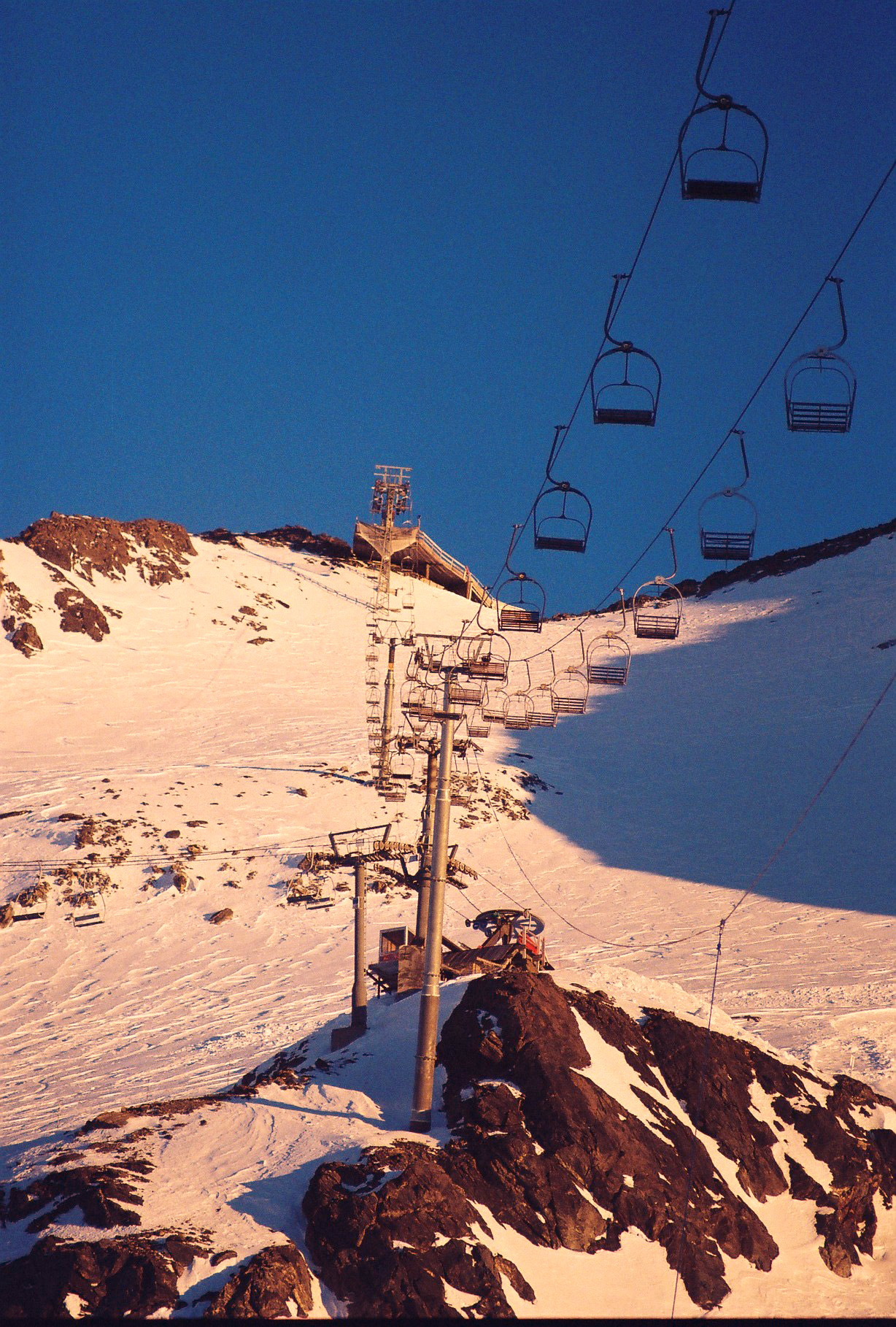 Zurück in das Jahr 1998. Längst ist Val Thorens eine renommierte Skistation, der Traum vom Sommerschi ist bereits fast zu Ende geträumt. Val Chavière hat es nie gegeben, das Sommerschigebiet an den Gletschern Thorens und Chavière ist nur noch im Winter in Betrieb und nur hinsichtlich des Teils, der auf der Nordseite des Grates liegt, die Anlagen am Chavière ruhen seit über zehn Jahren mittlerweile. Auch am Péclet wird im kommenden Sommer das letzte Mal ein wirklicher Sommerschibetrieb stattfinden, die meisten Schlepplifte der ersten Generation sind beinahe völlig verschwunden, in Betrieb ist keiner mehr. Stattdessen gibt es aber seit den frühen 80er Jahren einen zweiten Sessellift am Gletscher, den TSF "Glacier", der auf eben jener ausgesetzten Felsinsel endet, die dem TK Croissant seinerzeit als Bergstation diente und die Vorraussetzung für Überwindung der Eisfelder für den TSF 3300 ist. Aus Platzmangel teilen die beiden Lifte Glacier und 3300 hier sogar eine Stütze. Auch der Glaciersessellift hat eine absolut beeindruckende Überfahrtshöhe und eine gigantische Stütze am Rande des Eisfeldes (beides wurde mittlerweile geändert), an den Mythos des 3300 kommt er aber nicht heran. Ein Grund mag sein, dass der 3300 niemals im Winter läuft, nie. Immer steht er und erweckt Träume von jenem magischen Ort, zu dem er führt, dem höchsten Punkt der Trois Vallées, der dem Sommerschilauf allein vorbehalten ist.