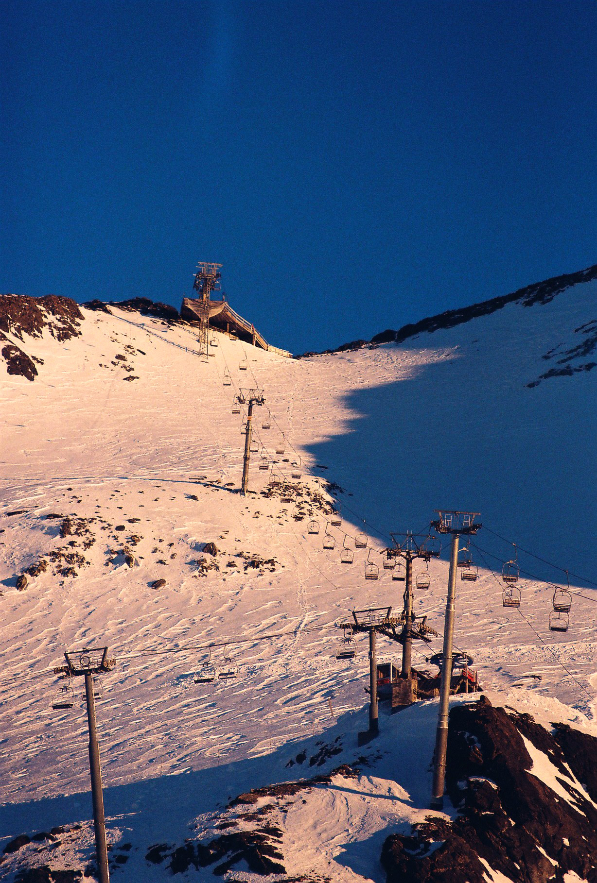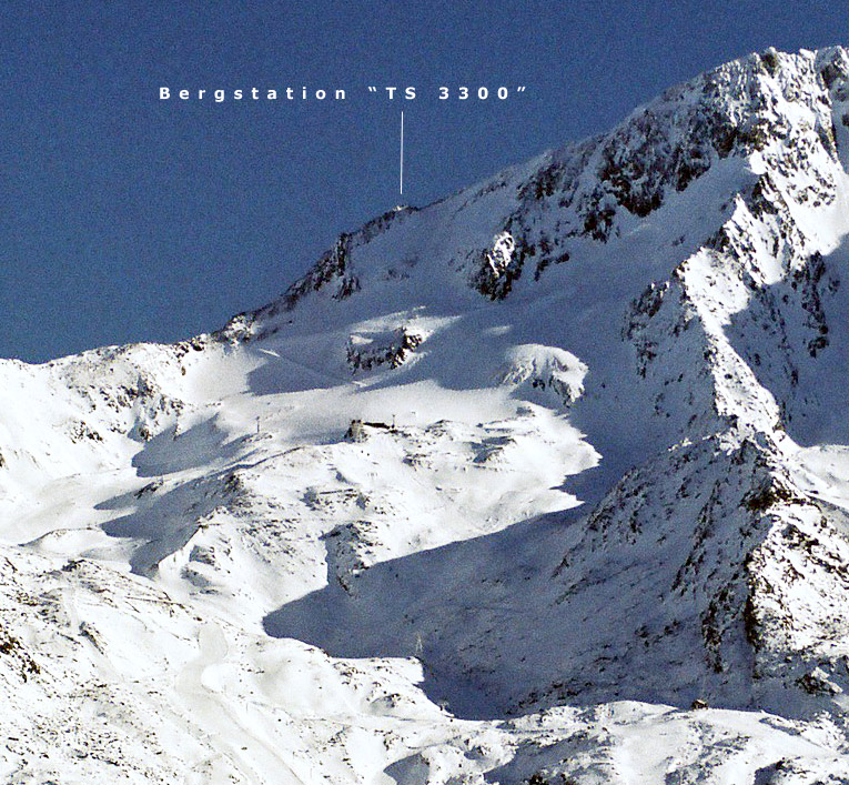 Die Talstation des 3300: man erahnt die Batterie aus Niederhaltern, die das Seil extrem in die Höhe umlenkt, um sodann über die erste Stütze die Reise über das Gletscherfeld anzutreten. Der ultimative Rösselsprung, wenn man so will.