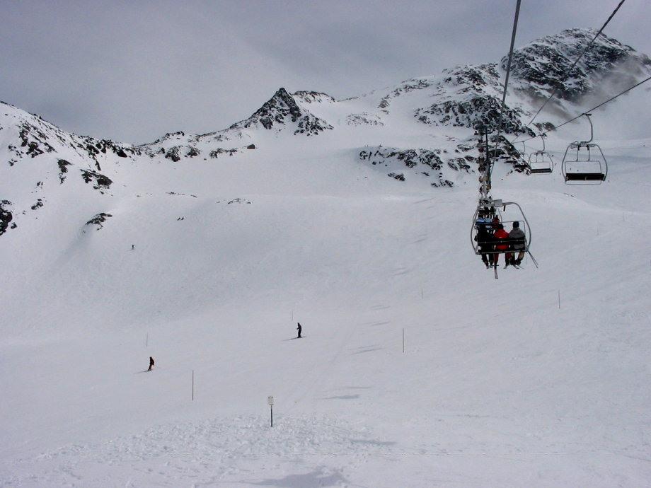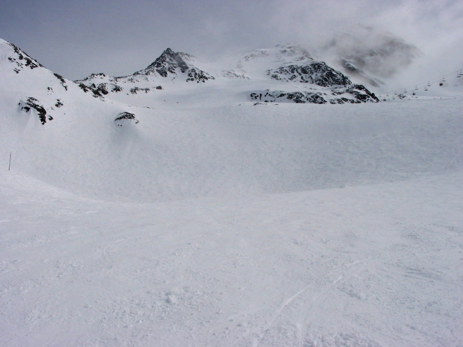Bald standen wir an der Funitelbergstation auf 2880m Höhe. Die Bergstation des 3300 sah wir immer sehr nah und doch entrückt aus auf ihrem Grat, der uns überragte. Zu allem Unglück lief der Glacierlift nicht, so dass wir bereits ab hier aufsteigen mussten. Langsam, Stück für Stück, die Höhe durchaus spürend, trugen wir die Schi hinauf, die Piste entlang zur Felsinsel, der Bergstation des Glacierliftes. Von hier aus war noch ein kurzer Weg gewalzt, einige Höhenmeter weiter, dann war Schluss!! Nach wenigen Metern im bauchtiefen Tiefschnee in diesem Steilhang merkten wir, dass wir unsere Schier dort nicht würden rauftragen können. Also ließen wir sie zurück, Tiefschneefahren konnten wir ohnehin beide nicht wirklich. Aber meine große Spiegelreflexkamera mit dem schwere Teleobjektiv, die nahm ich im Rucksack mit.