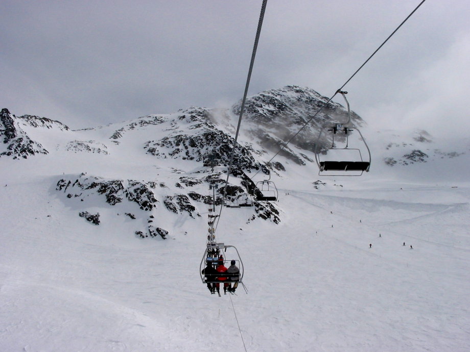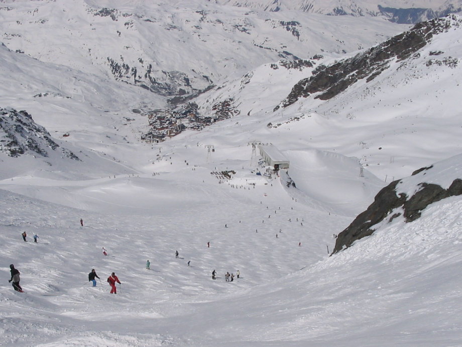 Tatsächlich erreichten wir unser Ziel so gut, dass es nicht mal etwas ausmachte, dass am vorletzten Tag alle Lift inklusive Funitel (!!!) wegen Windes geschlossen waren. Das war ein geniales Bild: da die Lifte nicht fuhren, waren bald alle Menschen auf den Straßen von Val Thorens: schätzungsweise eben 15.000 Leute, der Ort war ausgebucht. Ein Gedränge, wie auf einer Massenveranstaltung. Durch den Sturm war der Schnee weggeflogen auf den Straßen und das blanke Eis kam hervor. Die Menschenmassen rutschen hilflos auf den steilen Straßen umher, der Wind war aber so stark, dass man bergaufrutschte!!! Das habe ich davor und danach nie wieder erlebt, es war wie segeln oder surfen auf einem Eishang! Du konntest nichts machen, bis du irgendwann am Straßenrand in einen Schneehaufen geflogen bist - ein mords Spaß. Die Windgeschwindigkeit betrug über 120 km/h, so météo france.