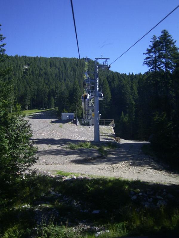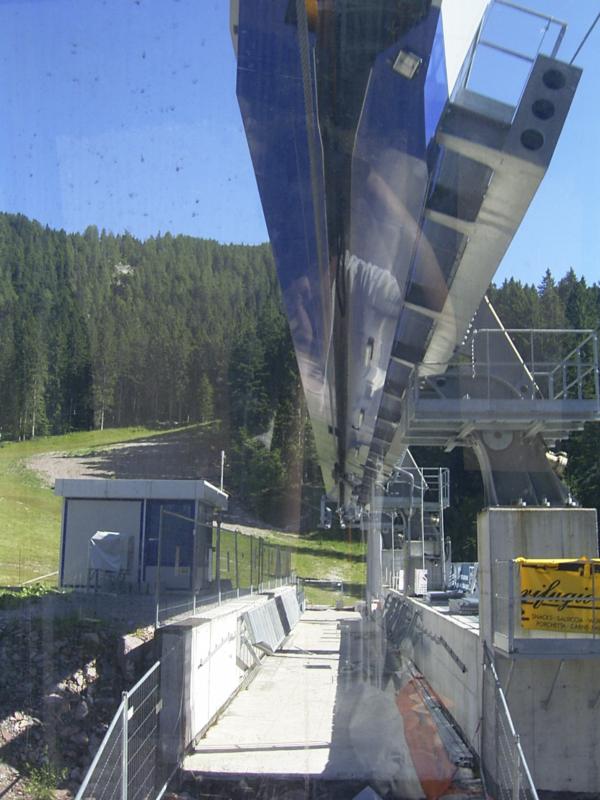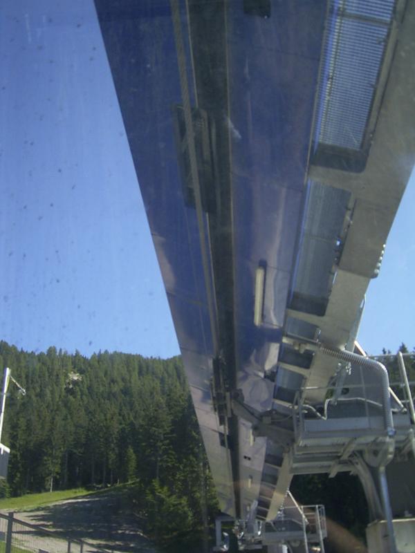 ^ Mittelstation; anscheinend wird im Sommer (Nur-Gondel-Betrieb) das Seil ausgehängt und über diese klappbare Stütze unterhalb geführt