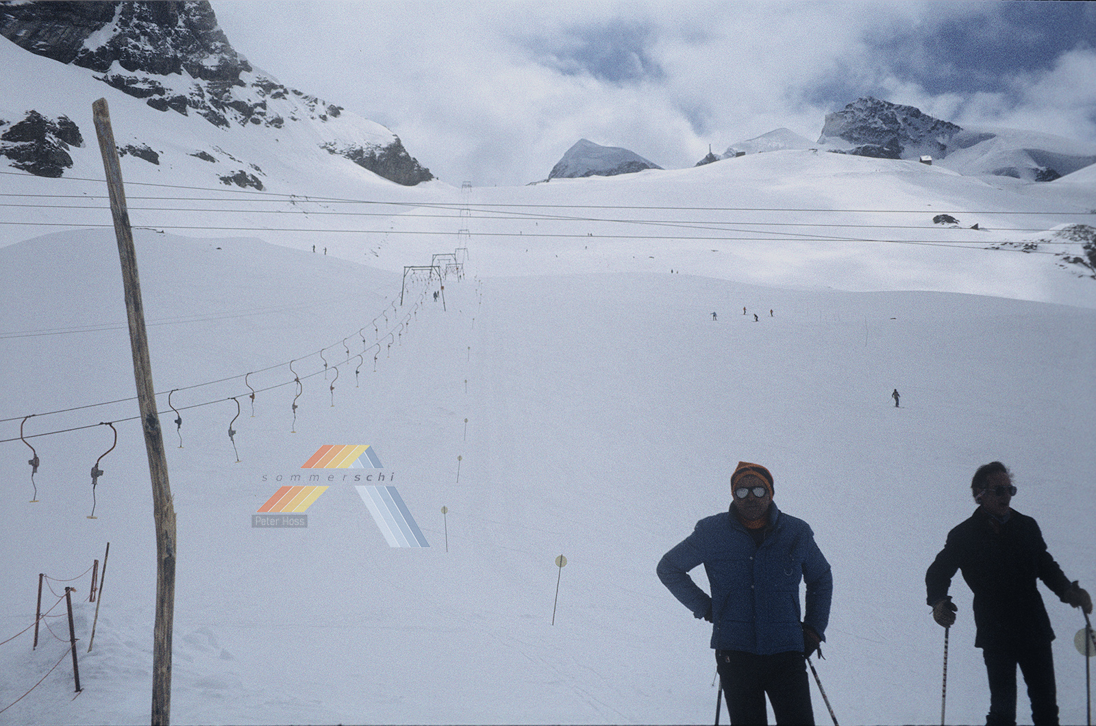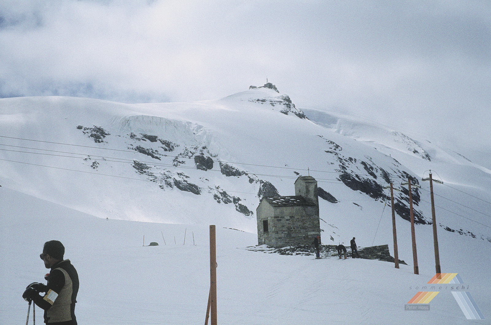 Die ersten drei Bilder sind, denke ich auf Cervinianer Seite im Bontadini-Sektor -- damals noch eine Schleppliftkette, mit interessanterweise hoehenverstellbaren Stuetzen -- wobei mir auch insbesondere die rotlackierten Strommasten gefallen. Italo Oldschool. 8)