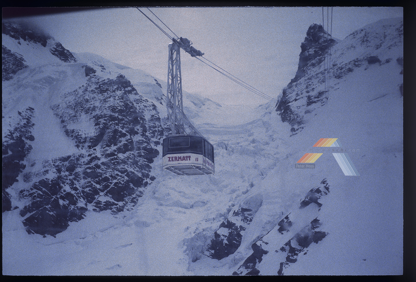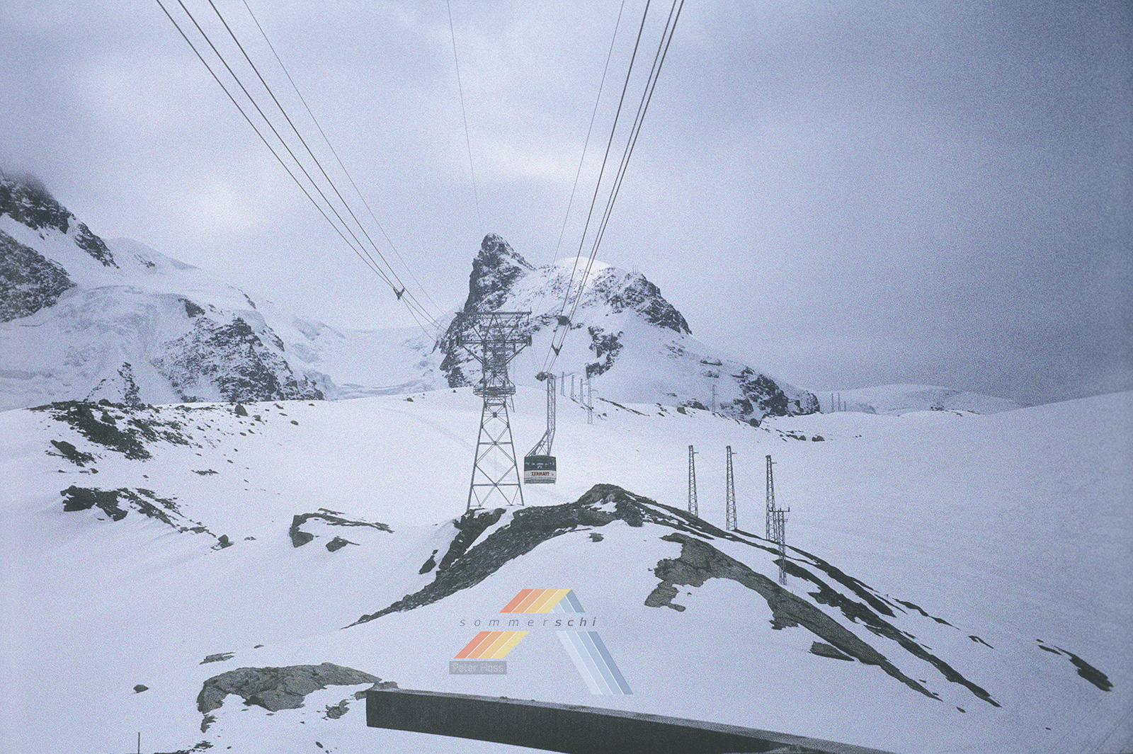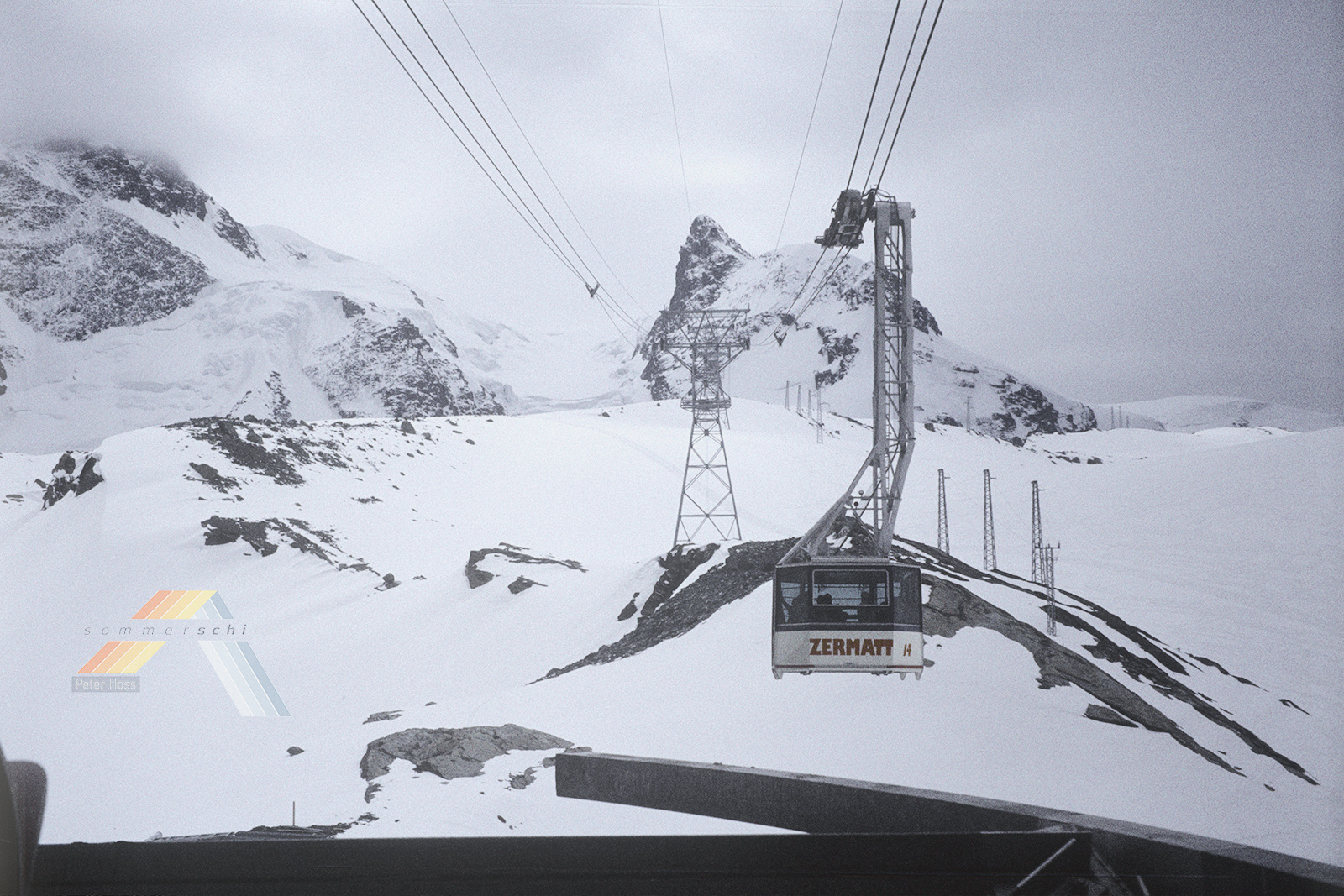 Eine brand-neuen Klein-Matterhorn Seilbahn -- zu diesem Zeitpunkt erst wenige Monate in Betrieb (Eroeffnung wohl 23. Dezember 1979, und diese Bildserie duerfte aus dem Fruehjahr 1980 sein). Unglaublich auch die Eisdicke am Klein-Matterhorn -- der Berg scheint kaum aus dem Gletscher herauszuragen. Es ist auch gut nachvollziehbar, wie im vorderen Bereich damals noch Abfahrten moeglich waren, ohne dass man die lange Kurve Richtung Plateau Rosa fahren musste. Ich meine, dass das bis Ende der 90er Jahre noch ging.