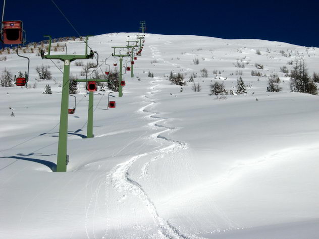 Im sommerbetrieb habe ich den noch nie in betrieb gesehen. Die letzten jahre war es so, dass die sessel erst spät montiert wurden, glaube anfang februar. Mag es sein dass sie die sessel deshalb erst so spät montieren, weil dann weniger starkwindtage herrschen? Im moment pfeifft es mit 87klm/h am gipfel, den masten ist es deutlich anzusehen, dass an diese oft sessel anschlagen, der lack ist grossflächig weggeschlagen an den entsprechenden stellen...