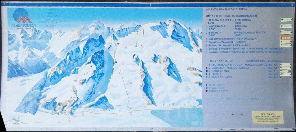 Elbetina: Die Piste kann man ebenfalls heute noch fahren, da man bei guter Schneelage von Elbettina auch bis Campitello weiterkommt. Aber vorsicht: am Col Rodella ist i.d.R. große Lawinengefahr! Daher wurde die Piste wohl auf nur sehr selten präpariert.