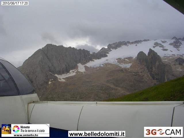 ^ Das Sommerskigebiet an der Marmolada, 1SL, 1 PB. Die Abfahrt wird bereits kurz nach Mittag frisch für morgen präpariert.