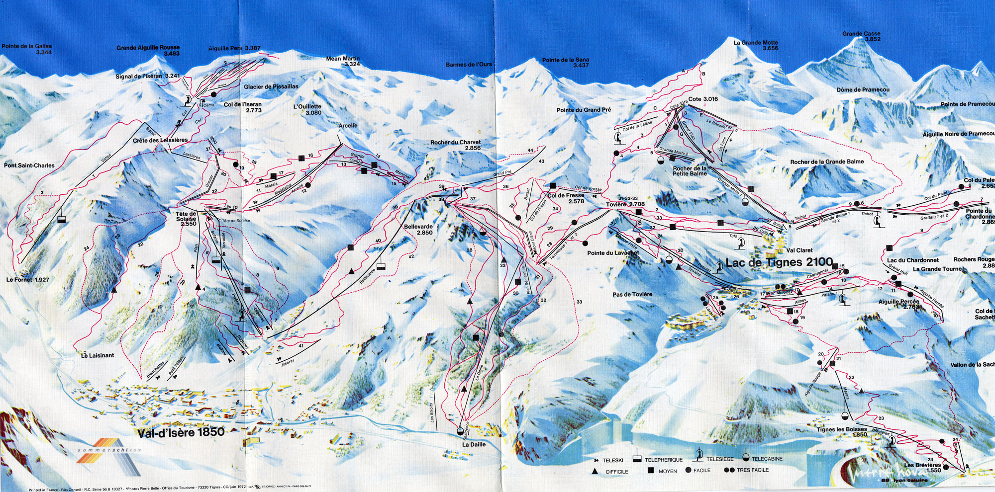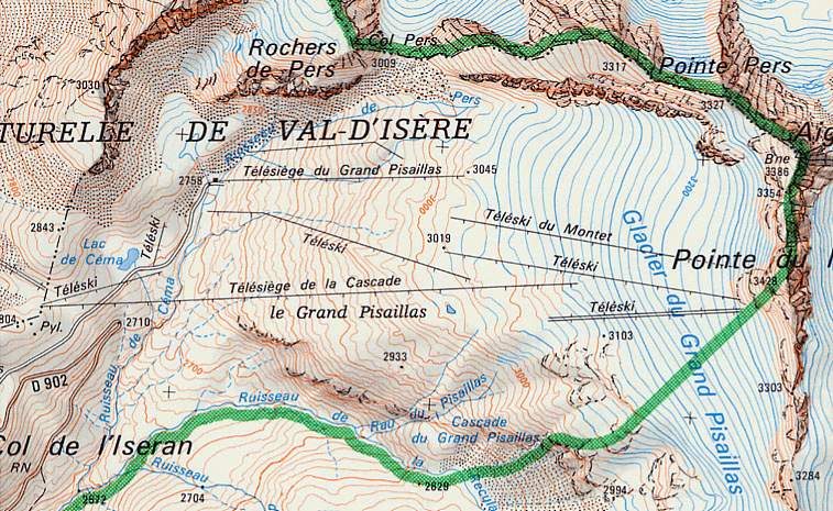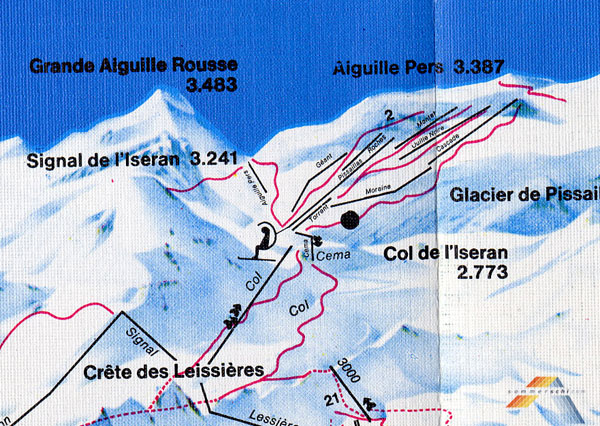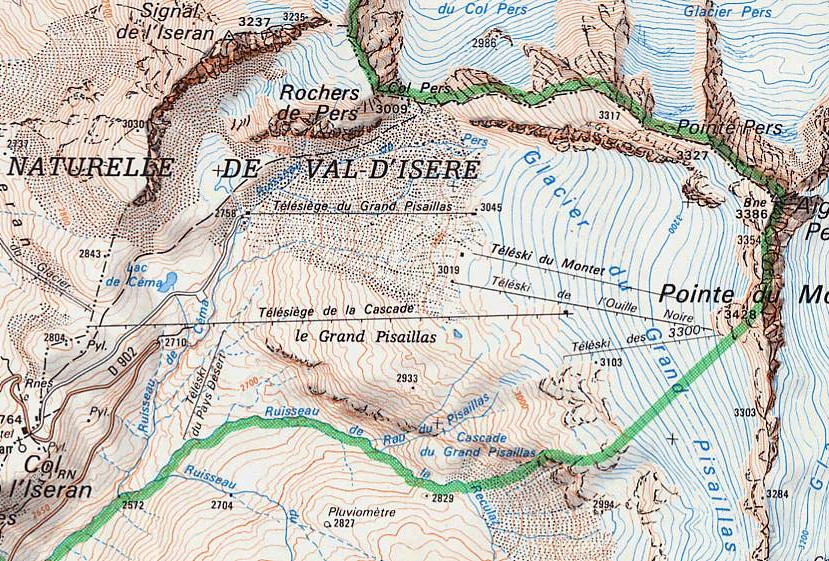 Tk du Col: dieses eine Jahr ohne Doppelung, gerade neu gebaut als Winterzubringer TK Céma: Rückbringer zur Passhöhe, den Namen trägt heute der neue Sessellift in selber Funktion zurück zum Pass, nachdem der TSF Cascades beim Neubau getrennt wurde. TK Torrent: Gegenstück zum TK Céma: Verbindung von der Passhöhe zu den Talstationen der Gletscherlifte, die vor dem Bau des TSF Cascade wesentlich weiter hinten in dem Hochtal angesiedelt waren (wohl weil der zerklüftete vordere Teil durch einen Schlepplift nicht zu überwinden gewesen wäre). Wurde mit dem Bau des TSF Cacades, der vermutlich 1973 stattgefunden hat (spätestens 1974), wohl obsolet, stand aber erstmal noch, der Karte von 1974 nach. TK Moraine: SL mit Talstation unweit des TSF Pissaillas und anschließender Kurve sowie Bergstation im Bereich der späteren Bergstation des TSF Cascades, erfüllte dessen Funktion von dessen Bau ca. 1973. TK Cascades: entspricht wohl dem TK des 3300 wie er bis Anfang des Jahrtausends stand, der Name dürfte im Zuge des Baus des TSF Cascades der Unterscheidung halber geändert worden sein. TK Ouille Noire: eine der zentralen Anlagen am Gletscher, die von den drei Hauptliften am Gletscher, die die 70er Jahre überlebten, als erste abgebaut wurde, vermutliche Stilllegung in den 90er Jahren. TK Montet: steht im Prinzip bis heute, wenn auch diverse male umgebaut und ersetzt, der letzte der einst unzähligen Gletscherlifte am Pissaillas. TK Roches: Schlepplift auf den untersten Gletscherhängen direkt oberhalb der Bergstation des TSF du Grand Pissaillas, scheint offenbar bereits bis 1974 abgebaut worden zu sein, möglicherweise versetzt als Doppelung des TK Cascades / 3300, die ebenfalls in dieser Zeit stattgefunden zu haben scheint. TSF du Grand Pissaillas: der erste Sessellift am Gletscher, der den Nordteil des Gletscherhochtals erschloss, meines erachtens eine interessante und schöne Anlage, deren Wegfall Anfang des Jahrtausends ich sehr bedauert habe. TK Géant: ein weiterer Schlepplift noch nördlich des TSF du Grand Pissaillas im heute unerschlossenen Bereich. Vermutlich zur Erschließung der dortigen Firnfelder. TK Aig. Pers: ein höchst interessanter Schlepplift, der offenbar den Col und die dahinter liegende Route einst erschloss, diese Route soll in den 70er Jahren auch im Sommer gut zu fahren gewesen sein, zumindest bis zur Bergstation der TPH Fornet bzw. den Kurven der Passstraße oberhalb, so wurde mir jedenfalls mal gesagt.
