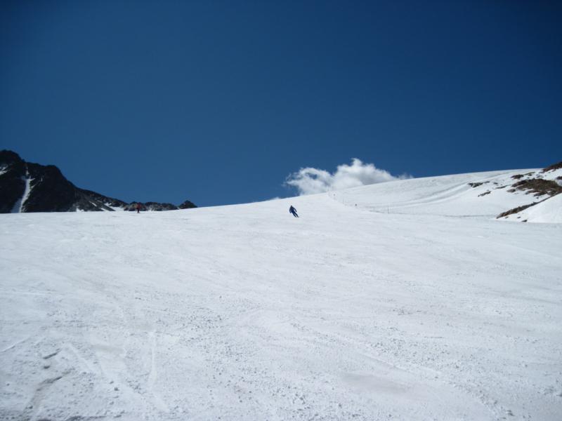 Dank eines Kaltlufteinbruchs (früh -7 Grad) mit etwas Neuschnee ging's sehr gut zu fahren, insbesondere auch die Rote zum Gletschersee, Finail sowieso. Zur Talstation Finail kam unter dem Neuschnee Blankeis raus. Aber man machte keine Anstalten, den Sommereinstieg zu aktivieren, geschweige denn die sonst üblichen Depots zu nutzen. Den Sommereinstieg gab's eh schon lange nicht mehr...