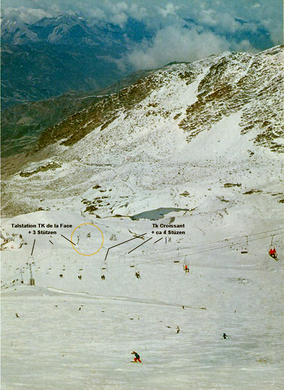 Die sehr dünne Kapitaldecke bewirkte jene seinerzeit für Val Thorens so typische Installation sehr langer Anlagen mit großem Höhenunterschied, so wurden mittels des TSF 3 Vallées etwa die gesamten Südhänge der Station erschlossen bei gleichzeitiger Anbindung an das restliche Schigebiet, die Anlage war über 2km lang und wies einen Höhenunterschied von über 600m auf. Bei einer Geschwindigkeit von 2,5 m/s bedeutete das immerhin eine Fahrzeit von etwa 14 min! Entsprechend lang waren dafür auch die erschlossenen Pisten, so dass diese Zeit wohl nicht so sehr ins Gewicht viel, auch waren Trasse und Panorama der Anlage von bemerkenswerter Schönheit! Problematisch war allerdings, dass schon ein starker Wind im obersten Gratbereich ausreichte, um die gesamten Südhänge des Schigebiete schließen zu müssen.