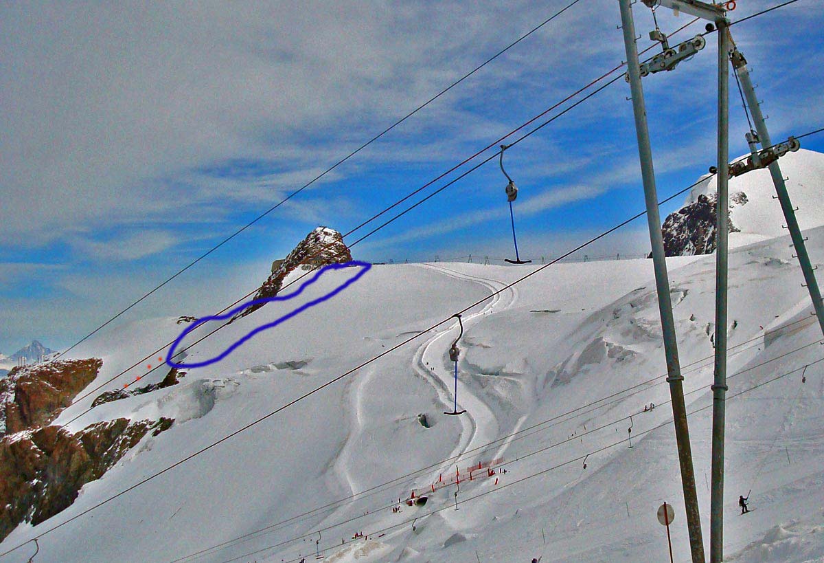 auf dem Bild: http://www.webdesign-hassloch.de/zermatt/Tag7_37.jpg (das ich AF fand), das aus der vergangenen Woche stammt, sieht man schoen wo die heutige "Abfahrt" langfuehrt. Ich waere das bei den aktuellen Schneebedingungen nicht gefahren. Allerdings sehen die Spuren danach aus, als wussten die Leute was sie tun, gerade wenn man betrachtet wie diszipliniert sie die untere Spaltenzone umfahren haben.