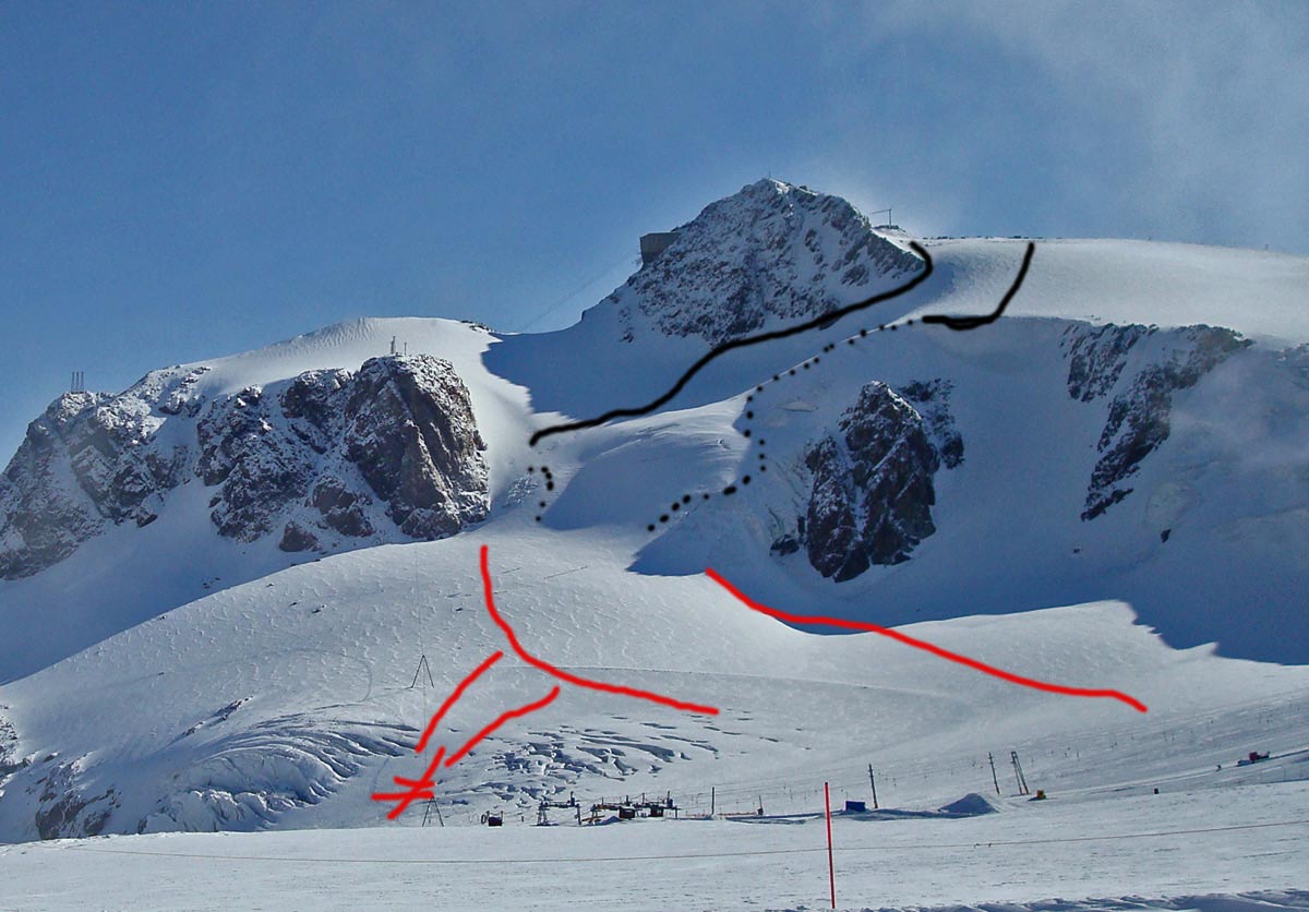 Hier nun ein markierter Blick auf die Speed-Piste: Im Prinzip geht die immer noch, wären da nicht in der Einfahrt riesige Spalten, die sich quer durch den ganzen Hang ziehen. Die Dinger waren vor Jahren schon wirklich heftig und richtig tief und die Situation wird sich wohl nicht bessern. Hier entsteht eine weitere Spreizungs-Zone, die die Oberfläche des Gletschers zerklüften lässt.