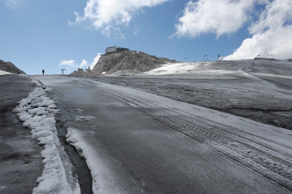 Meines Wissens wurde der Gletscher gesalzen (oder sonstwie mit Chemikalien bearbeitet), um die oberste Eisschicht auffirnen zu lassen und so Sommerskilauf auf der blanken Eisfläche zu ermöglichen. Ich habe allerdings im Moment keine Quelle dafür, außer meiner Erinnerung.