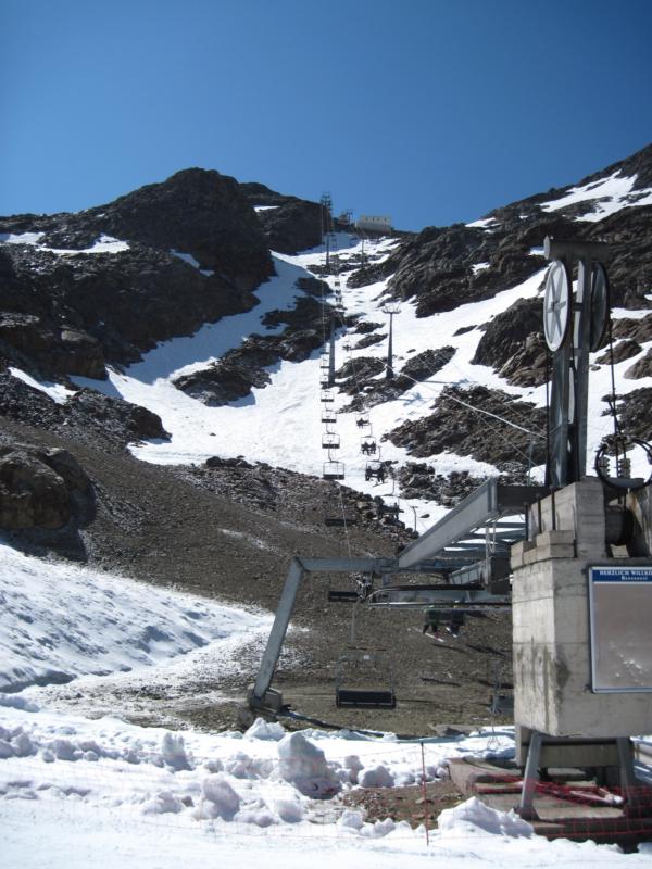 Dank eines Kaltlufteinbruchs (früh -7 Grad) mit etwas Neuschnee ging's sehr gut zu fahren, insbesondere auch die Rote zum Gletschersee, Finail sowieso. Zur Talstation Finail kam unter dem Neuschnee Blankeis raus. Aber man machte keine Anstalten, den Sommereinstieg zu aktivieren, geschweige denn die sonst üblichen Depots zu nutzen. Den Sommereinstieg gab's eh schon lange nicht mehr...