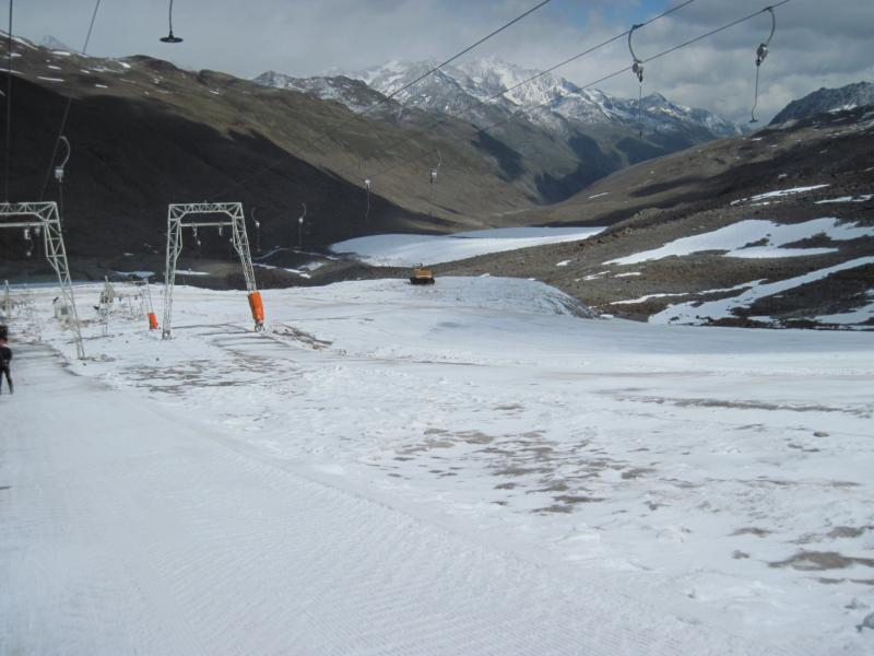 - Der Gletscherschwund an der Bergstation Finail verschmälert die (südlich gelegene) Piste zunehmens. Diese ist im oberen Teil nun schon eine Terrasse tiefer als die Schleppspur und nur noch ca. 2 Bully-Spuren breit.