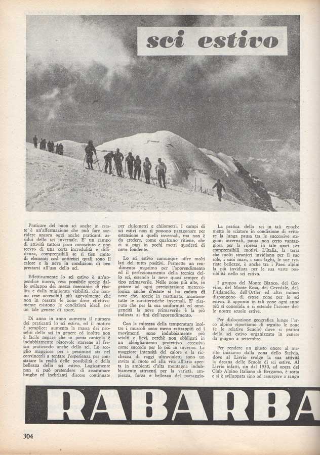 Di anno in anno aumenta il numero dei praticanti lo sci estivo, ed il motivo e semplice; aumenta la massa dei proseliti dello sci in genere ed inoltre non è facile negare che in piena canicola è indubbiamente piacevole starsene al fresco praticando anche dello sci. Lo scoglio maggiore per i pessimisti sta nel convincerli a tentare l'esperienza per constatare la realtà delle possibilita e della bellezza dello sci estivo. Logicamente non si può pretendere di assommare lungbe ed inebrianti discese continuate per chilometri e chilometri. I campi di sci estivi non si possono paragonare per estensione a quelli invernali, ma non è da credere, come qualcuno ritiene, che ci si pigi in pochi metri quadrati di neve fondente.