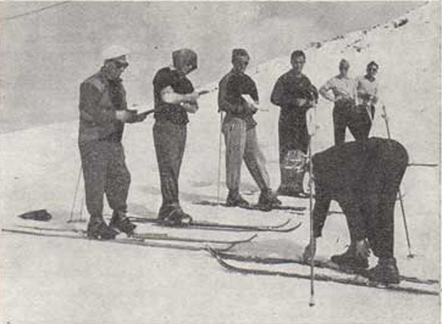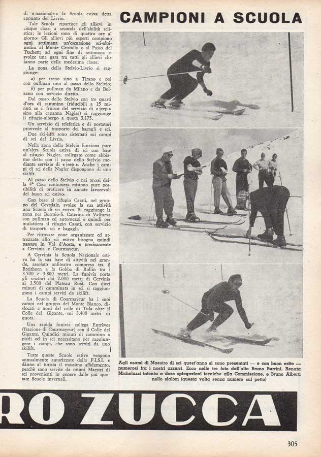 Per rendere un giusto onore al merito iniziamo dalla zona dello Stelvio, dove al Livrio svolge la sua attività la decana delle Scuole di sci esti ve. Al Livrio infatti, sin dal 1930, ad opera del Club Alpino Italiano di Bergamo, è sorta e si è sviluppata sino ad assurgere a rango di «nazionale» la Scuola estiva detta appunta del Livrio.