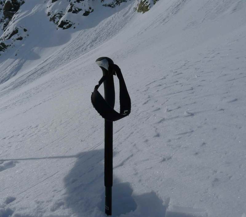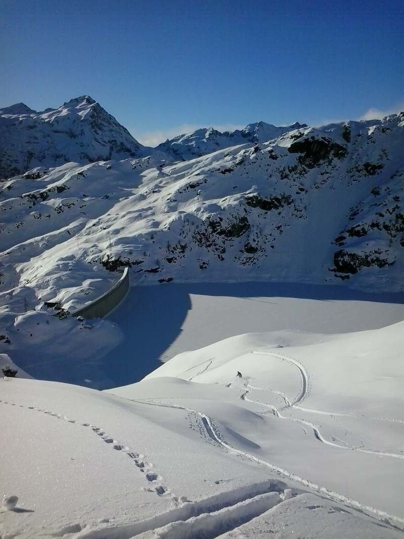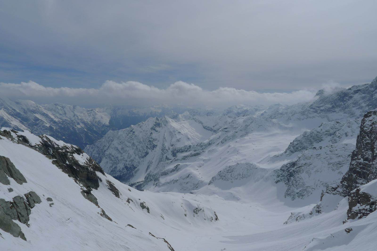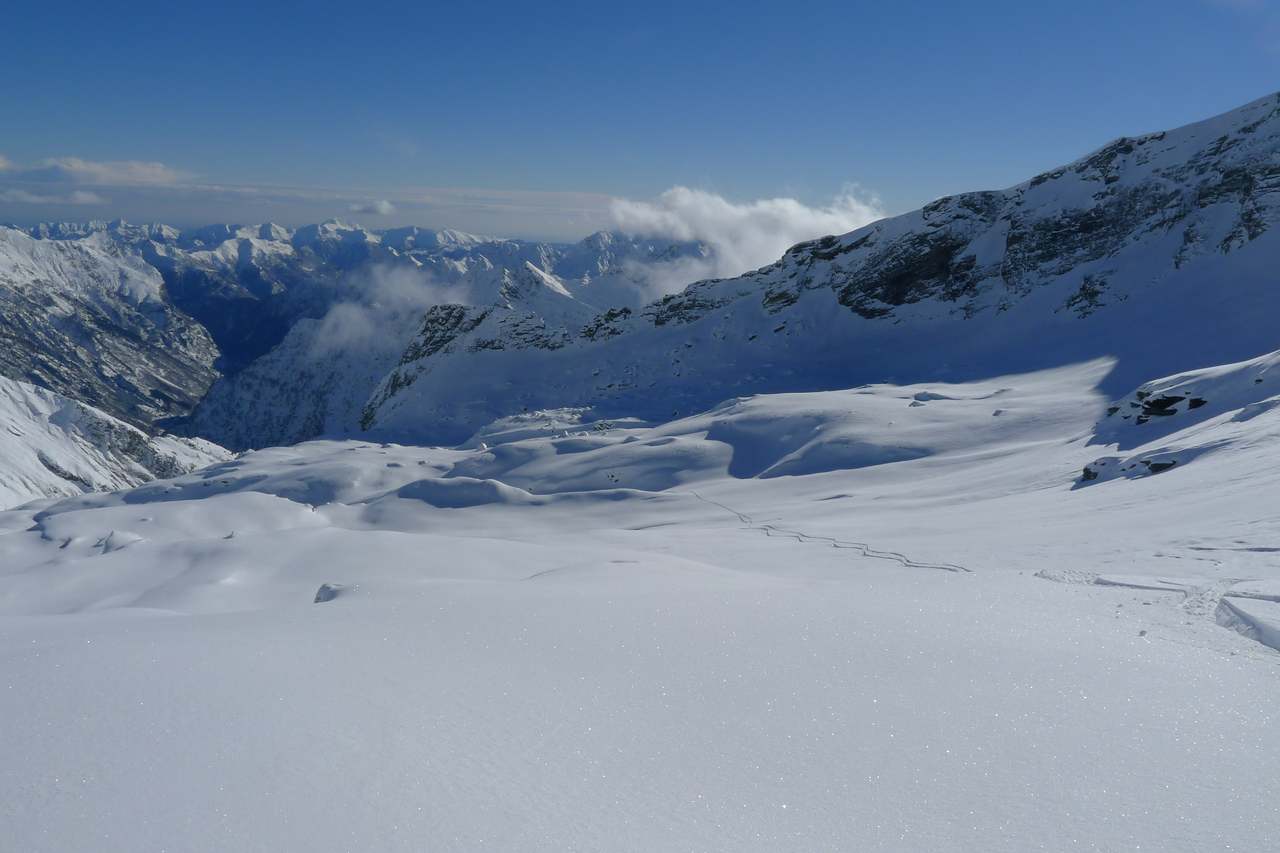 Etwas unterhalb des schmalen Sommerweges, noch oberhalb der Brücke, hat dann ein Begleiter einen Ski verloren. Trotz Skibremse fuhr der Ski leider weiter gen Tal, flog durch die Luft und stach an der Kante zur Schlucht in die Schneedecke ein. Zum Glück konnte ich das ganze von oben live beobachten und so machte ich mich auf die Suche. Die einzelne Skispur war zu finden, dann hörte sie auch und dann gabe es da ein Loch im Schnee, gefühlt über dem Abgrund. Ich habe mich dann rangetastet, gewartet bis die anderen da waren, die Stabilität der Schneedecke getestet und mich dann von einem anderen noch am Skistock halten lassen. Dann tief bücken, Hand in den Schnee, tiefer, tiefer und dann - das Skiende. Jetzt noch ganz vorsichtig rausziehen und vorsichtig rausschieben. Geschafft, der Ski und der Tag gerettet und es konnte weitergehen. Zum Indren und dann Canale Grande. Ging gut, aber lang nicht so viel Neuschnee wie im Valsesia.