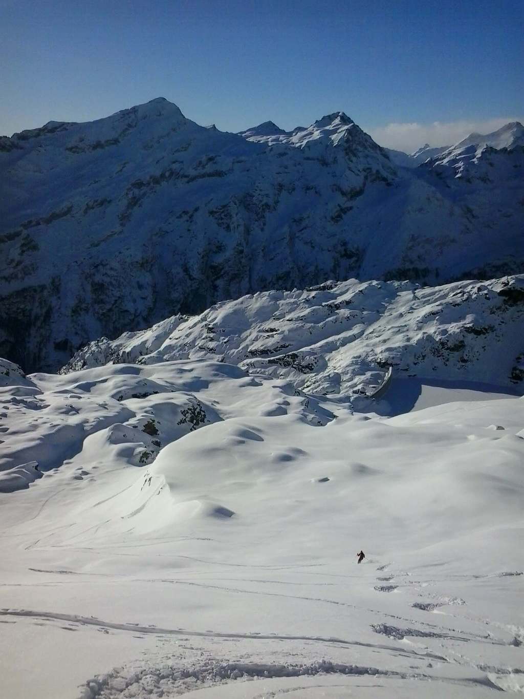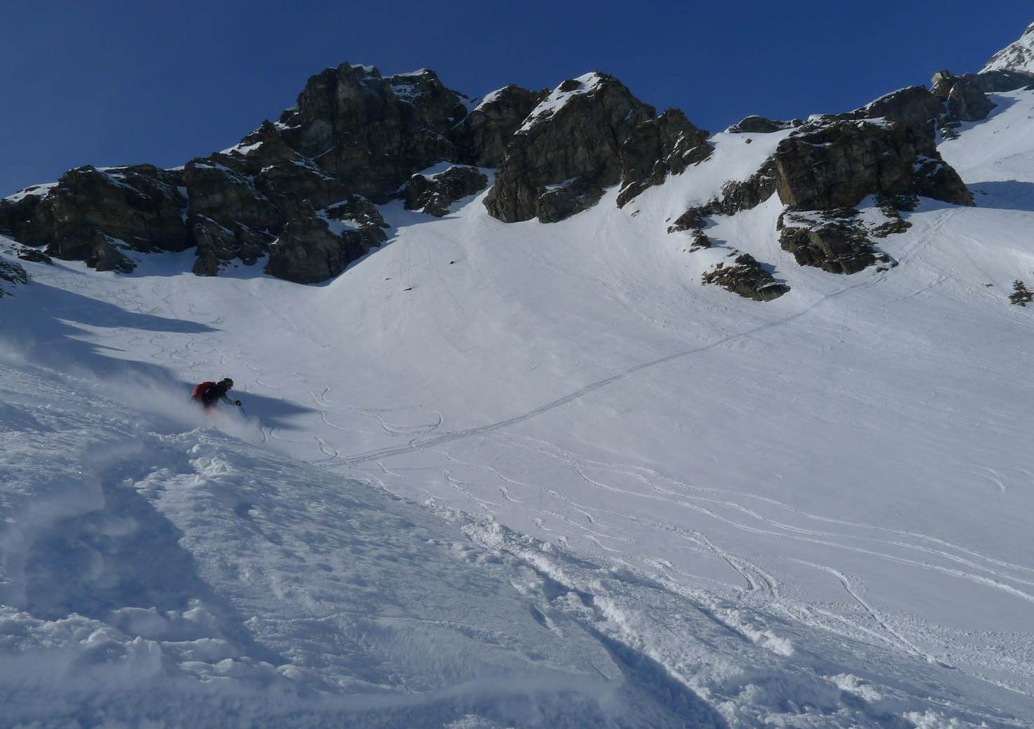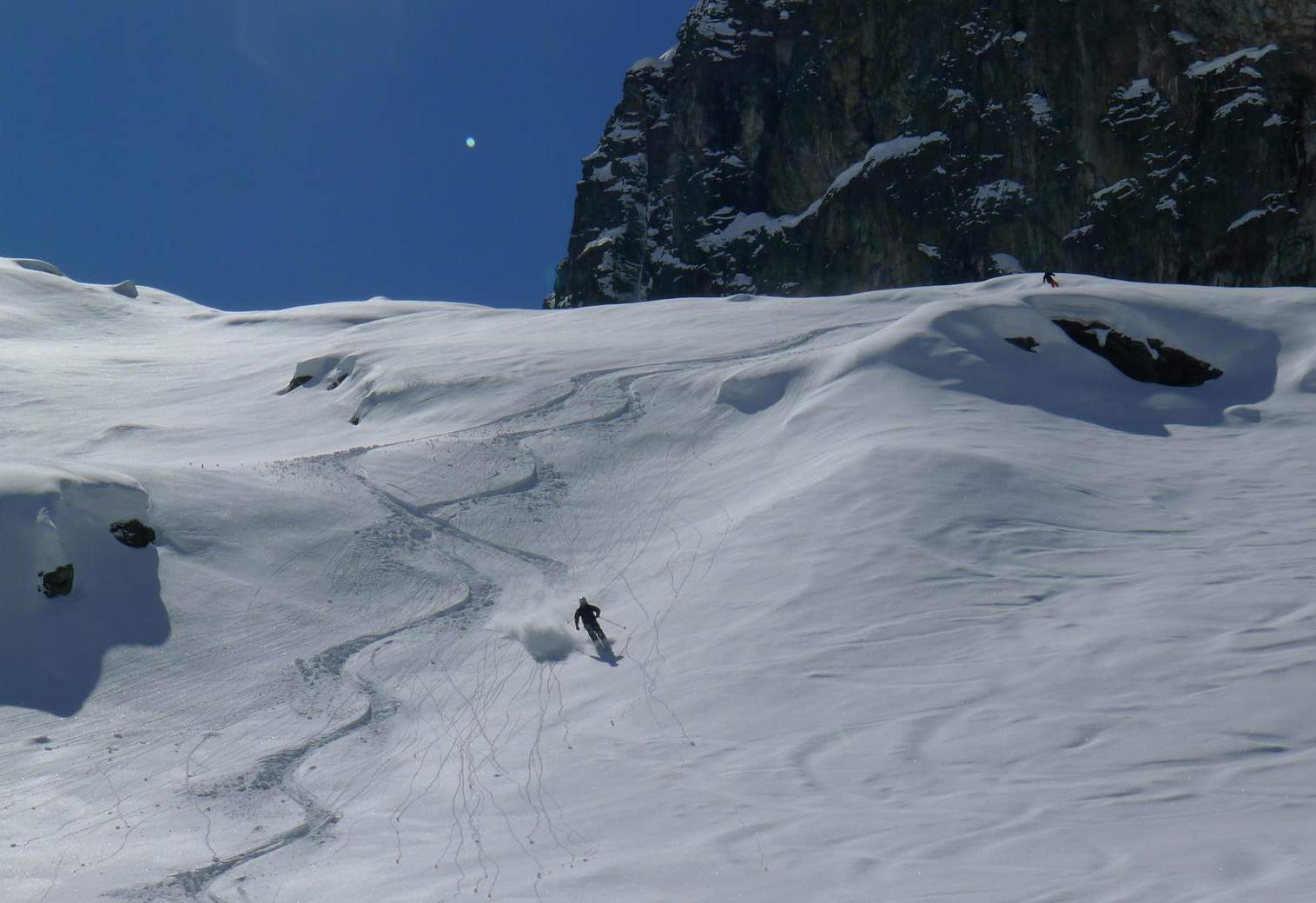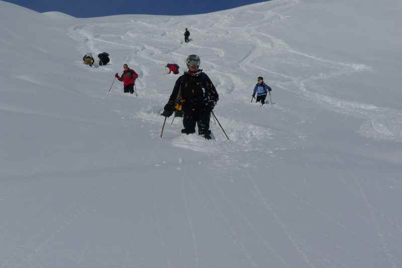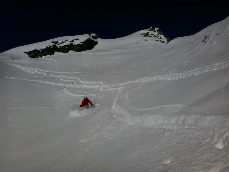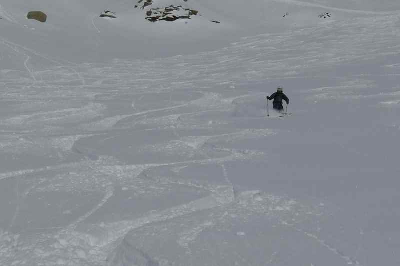 Am letzten Tag haben wir wieder die Felle ausgepackt und uns etwas Freiraum von den übrigen Freeridern verschafft. Salati war wegen Wind zumindest zeitweise geschlossen. Auch noch 5 Tage nach dem letzten Schneefall perfekte Verhältnisse.