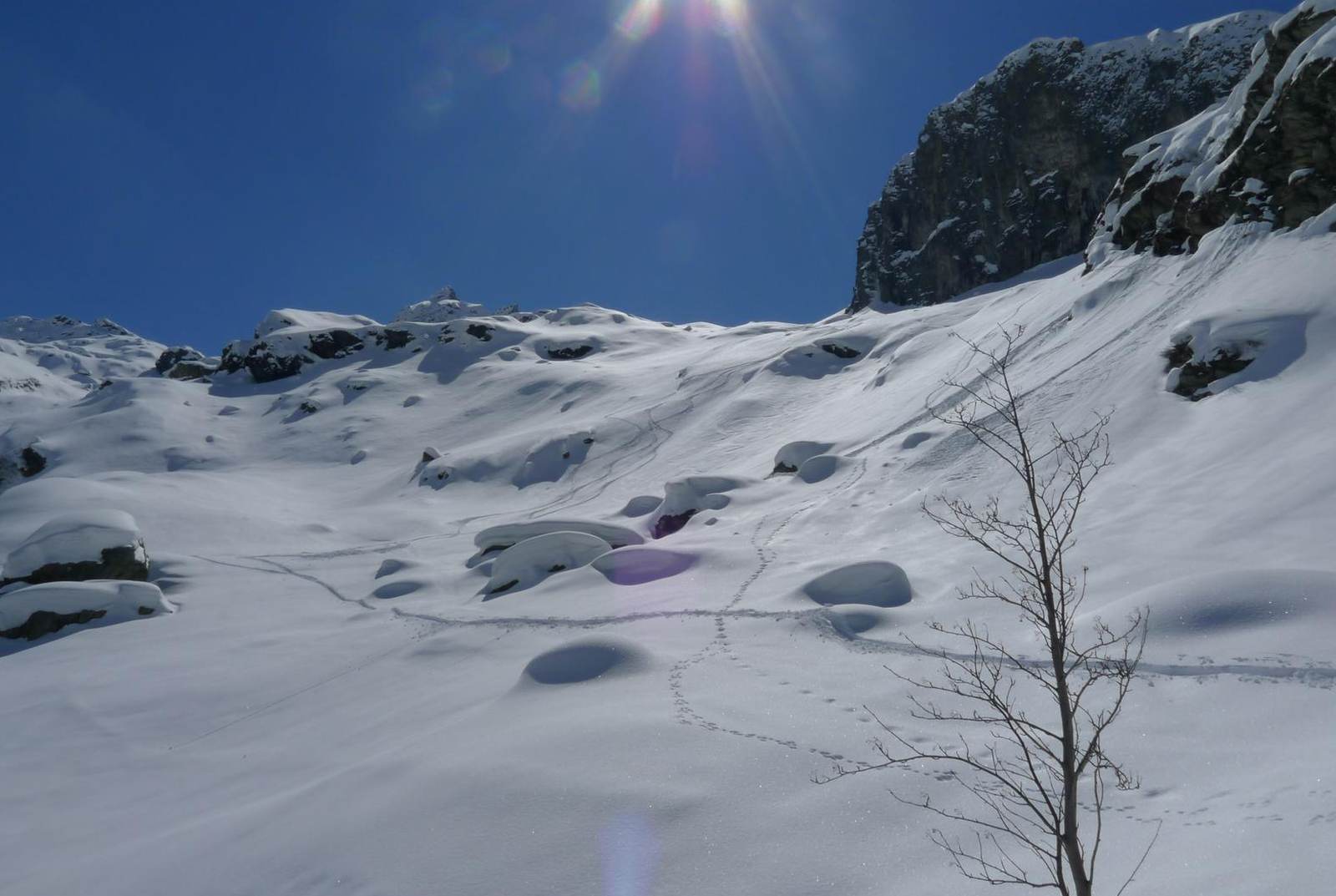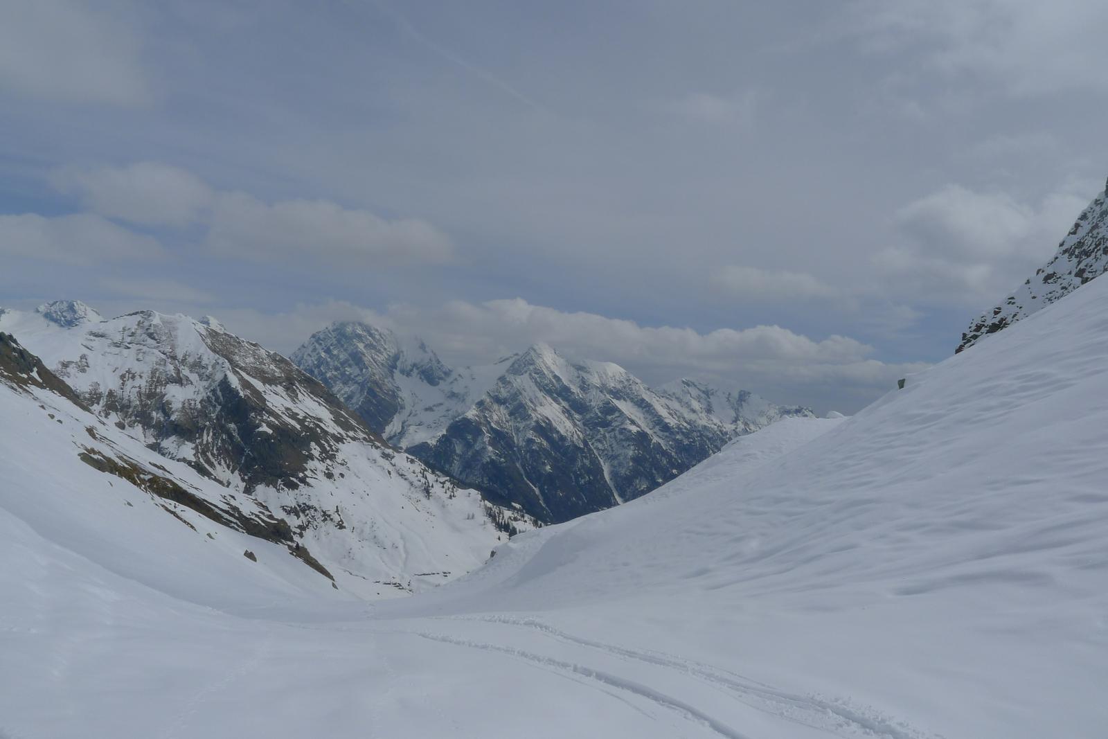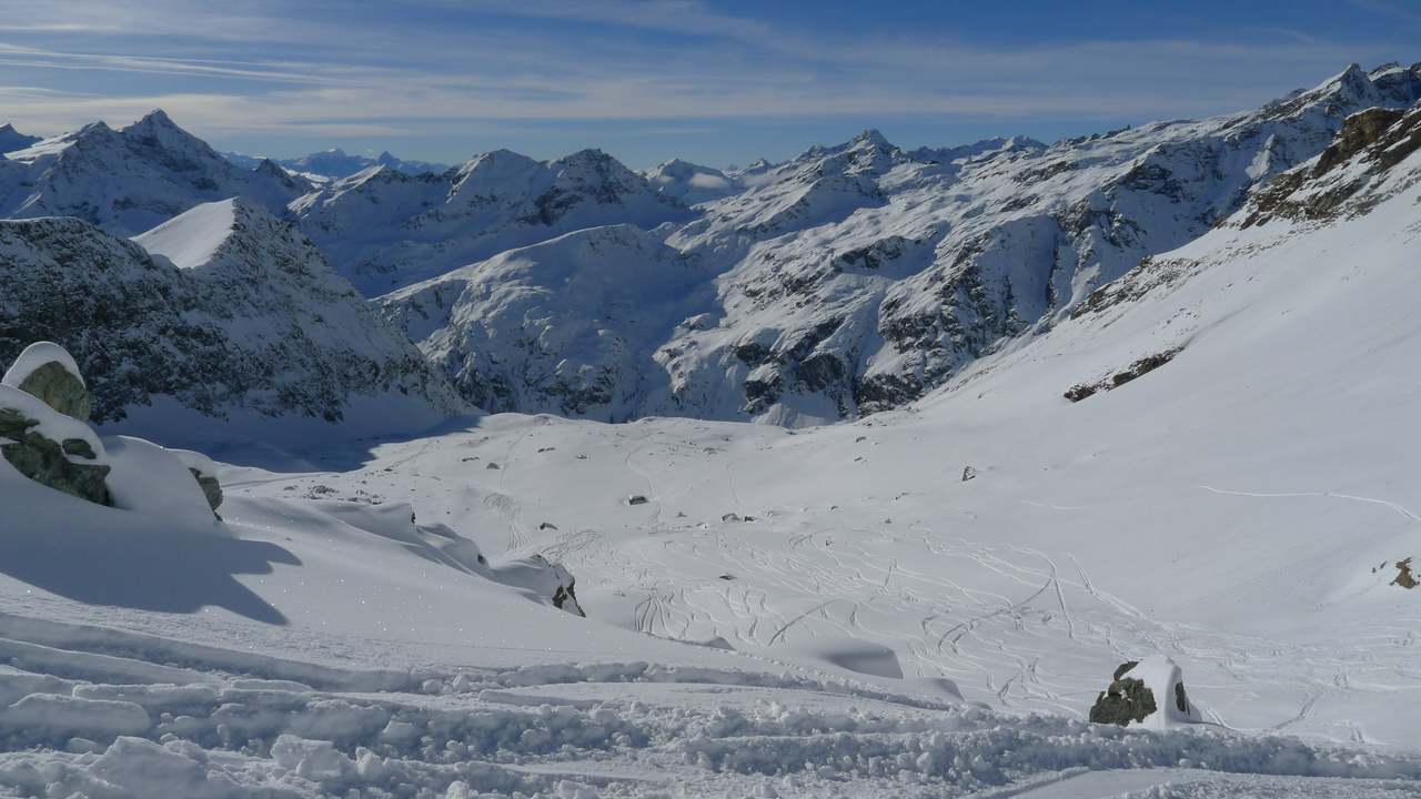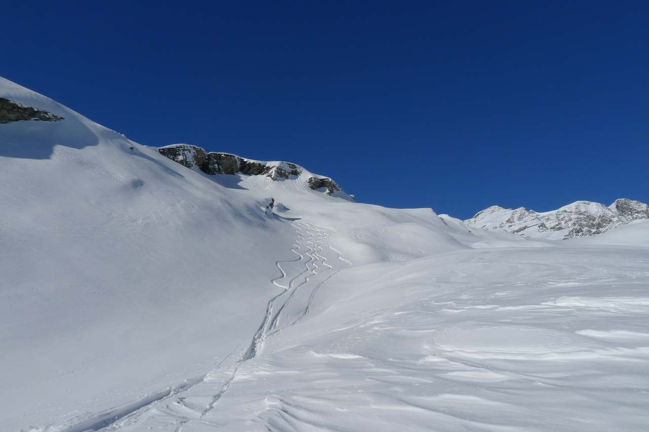 Am nächsten, ebenfalls schönen Tag wurden dann die Felle ausgepackt und das Val d’Otro angepackt. Der Einstieg ist schonmal sehr vielversprechend und die beiden Spuren sind ideal bei Flachstücken. Besser kann es nicht losgehen.