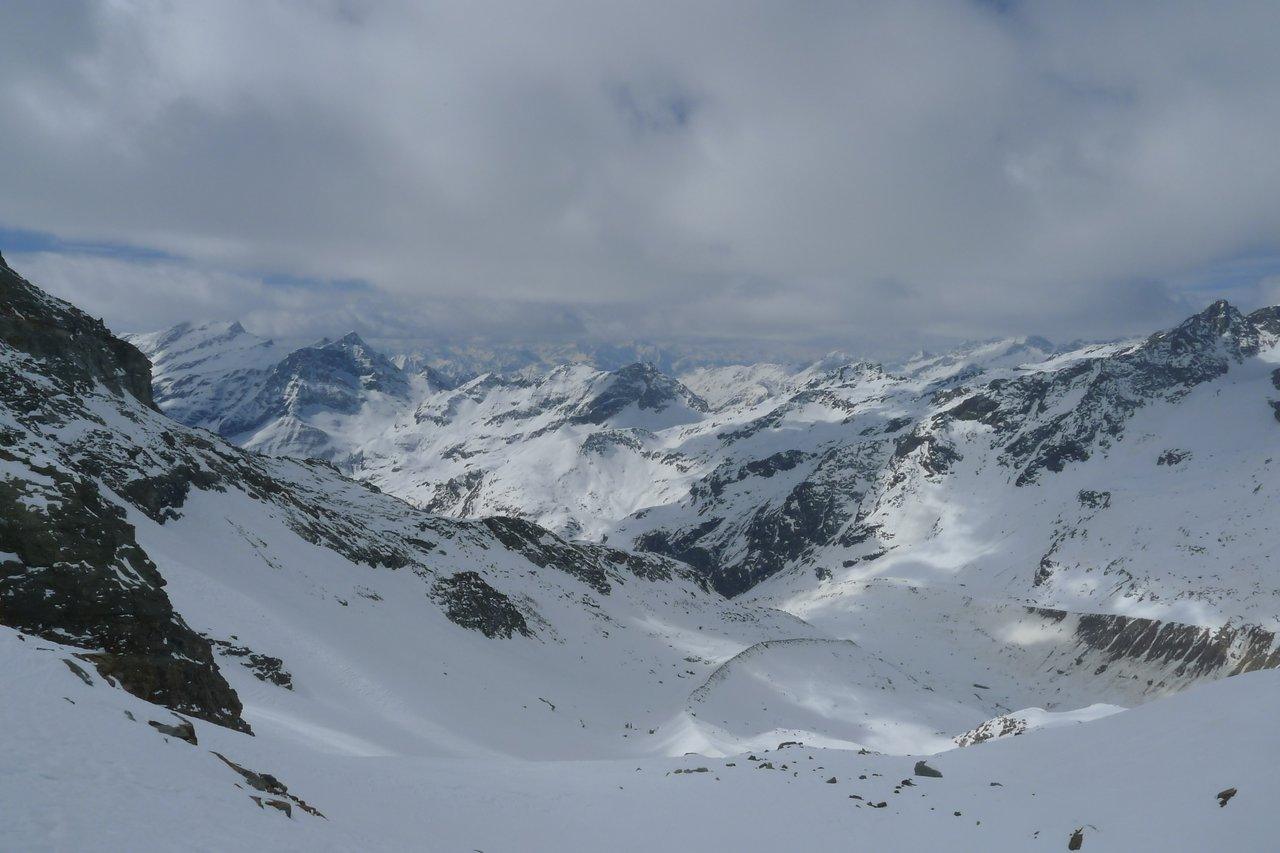 Auch auf der Piste gab es noch etwas tieferen Schnee und so war die Abfahrt nach Pianalunga kurzweilig. Dann wieder hoch und sieh da, ein Führer mit Gruppe hatte sich so die Hälfte bis zur ehemligen Guglielmina-Hütte vorangewühlt. Unser Dank war ihm gewiss. So sah es dann am Start aus.