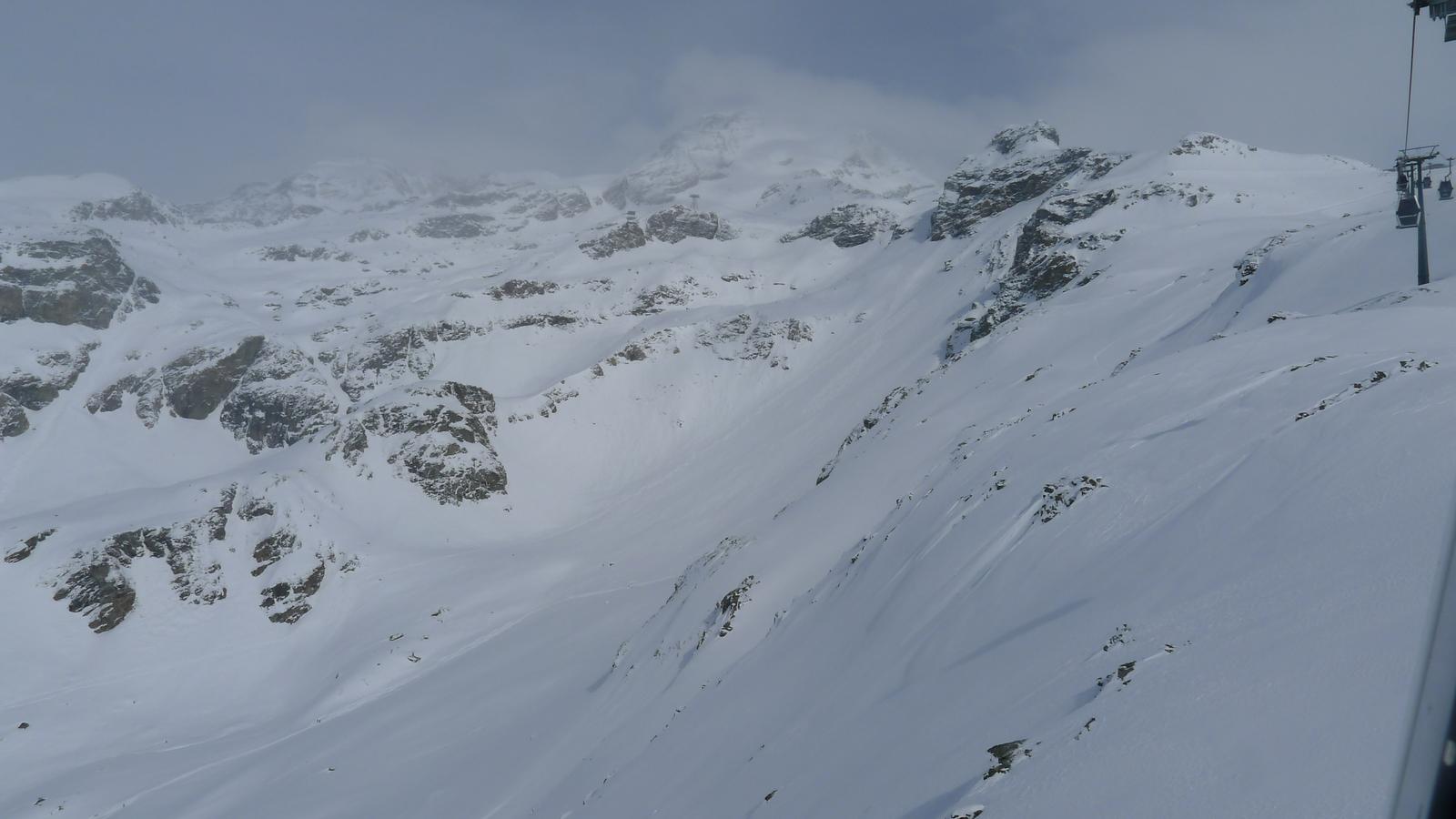 Der Schnee war aufgrund des Windes nicht fluffig sondern recht dicht abgelagert, auch mit breiten Ski waren Geschwindigkeit und Rückenlage erforderlich, um nicht abruppt abzustoppen. Nach diesem zweischneidigen Erlebnis sind wir dann ins Tal nach Alagna gefahren, was wir schon früher hätten machen sollen. 20 - 30 cm Pulver auf der Piste, ein Traum, den wir dann gleich wiederholt haben.