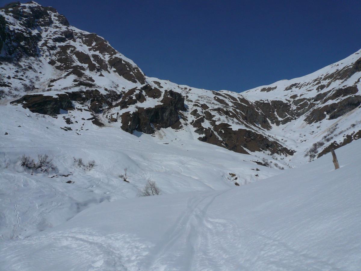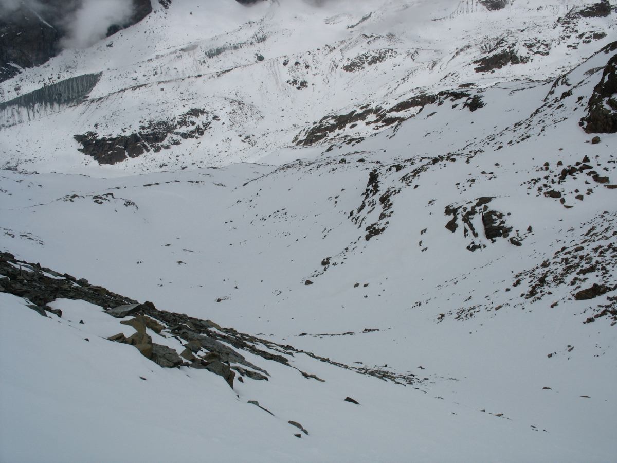 Nach Madesimo gings also nach Gressoney. Am ersten Tag wars windig und die Eiergondel zum Salati war gesperrt. Also auf nach Champoluc und einen Überblick über die aktuelle Situation gewinnen. Wie schon im Form diskutiert lag im Tal ordentlich viel Schnee, jedenfalls völlig ausreichend. Die Gletscher dagegen sahen jämmerlich schneefrei aus, die Höhenlagen knapp darunter vielfach abgeblasen. Es gab jedoch auch Stellen mit viel Schnee, die diesmal anders verteilt waren als meist sonst. Dazu wurde es warm bis sehr warm mit entsprechenden Folgen für den Schnee in Talnähe. Den ersten bemerkenswerten Abstecher ins Gelände gab es am Colle Sarezza. Nach kurzem Aufstieg erschloss sich dort eine nette recht steile Abfahrt, in der sich noch der Pulverschnee gehalten hatte – sozusagen ein Appetithappen für den Einstieg. Dateianhang: Der nächste Schneetest fand dann an der Bettaforca statt. Das Gelände dort war gut zu fahren, jedoch fast schon pistenmäßig ausgefahren und unten sehr weich. Die Route von der Gegenseite (sie geht ungefähr in Bildmitte lang): Dateianhang: Am nächsten Tag waren Salati – Indren bei meist sonnigem Wetter geöffnet, also gings sofort nach oben und weiter zur ehemaligen Balma-Piste. Der Einstieg war ungewohnt schneearm, aber dann lag mehr als genug Schnee. Und er war gut zu fahren, aber natürlich war mehr oder weniger alles zerspurt. Im Olen-Tal das gleiche Bild. Daher – in Abstimmung mit dem Sonnenstand - weiter zum nächsten Highlight, dem Salza Tal: Nach etwas mühsamer da schneearmer Zufahrt tat sich ein besonderer Leckerbissen auf, ein recht langer, steiler, ideal aufgefirnter und oben noch unverspurter Schneeteppich bis in den flacheren Talboden. Dateianhang: Danach gings gemütlich im schönen Salza Tal nach Staffal, natürlich immer wieder mit Seitenblicken auf das tolle Panorama. Dateianhang: