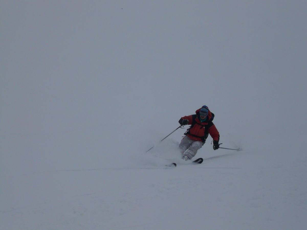 Der nächste Tag brachte dann den angesagten starken Schneefall – Indren blieb geschlossen. Morgens war es noch warm, unter 2200 m schneite es sehr feuchten Schnee. Daher weg von der Bettaforca und rüber zum Salati und in den Pulver – und die dichten Wolken und den frischen Wind. Da das Olental offensichtlich alle Freerider anzieht habe ich es gemieden und habe mich der Gabiet-Seite gewidmet. Dort gibt es ja ebenfalls schönste Hänge – und niemand der sie an dem Tag nutzte. Bei knietiefem Pulver und dichter Beschneiung von oben ein besonderes Flair, man muss es erlebt haben...