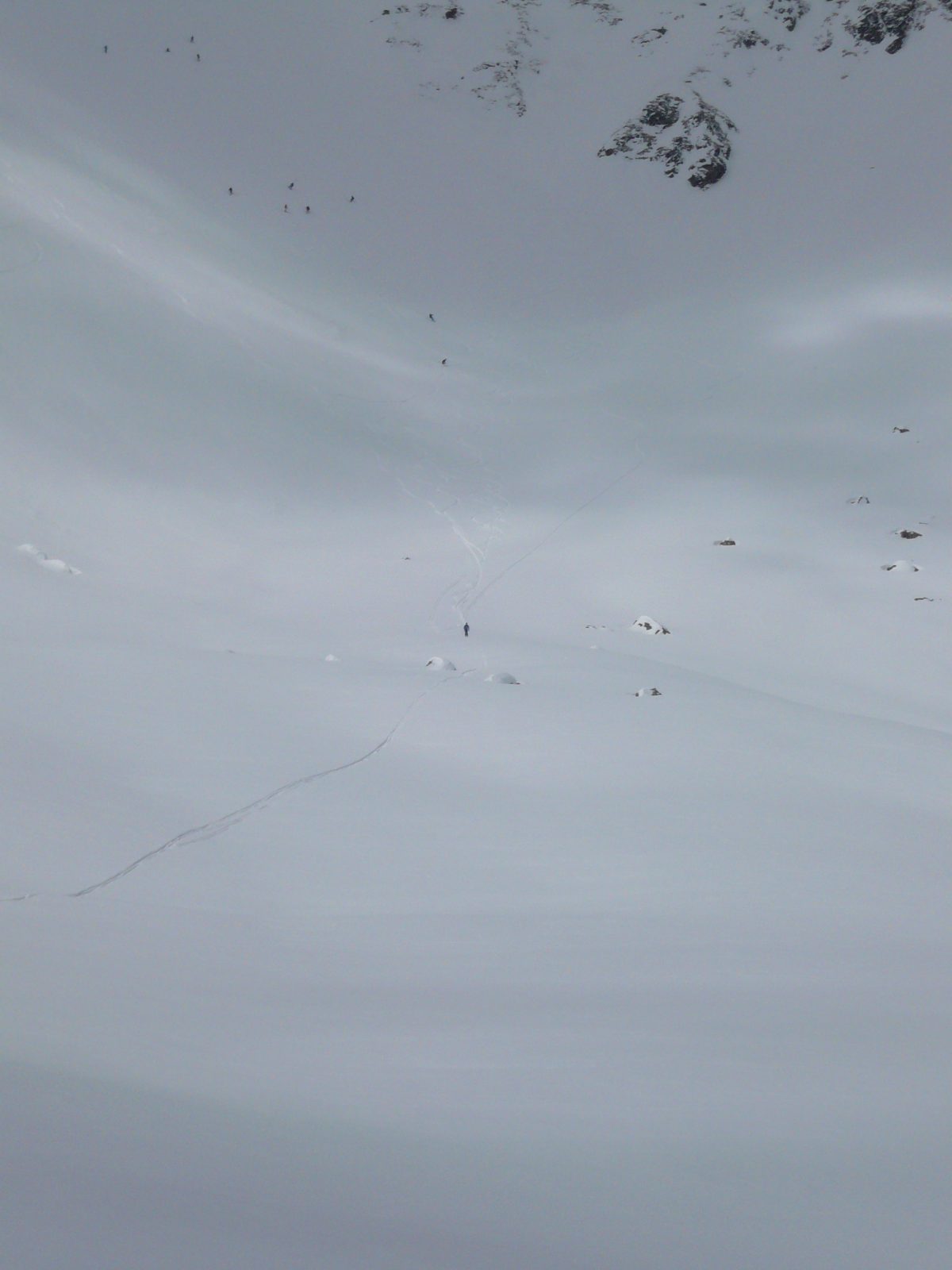Also wieder rauf zum Salati und wieder zur Balma, allerdings auf anderem Weg und für Faule ohne Aufstieg. Drei freundliche Skifahrer hatten schon einige Steine zur Rechten freigelegt, so dass die Hinderniss klar erkennbar waren. Die Einfahrt gestaltet sich daher bequem und steinfrei. Schön steil und tiefer Pulver – ein Genuss wie selten.