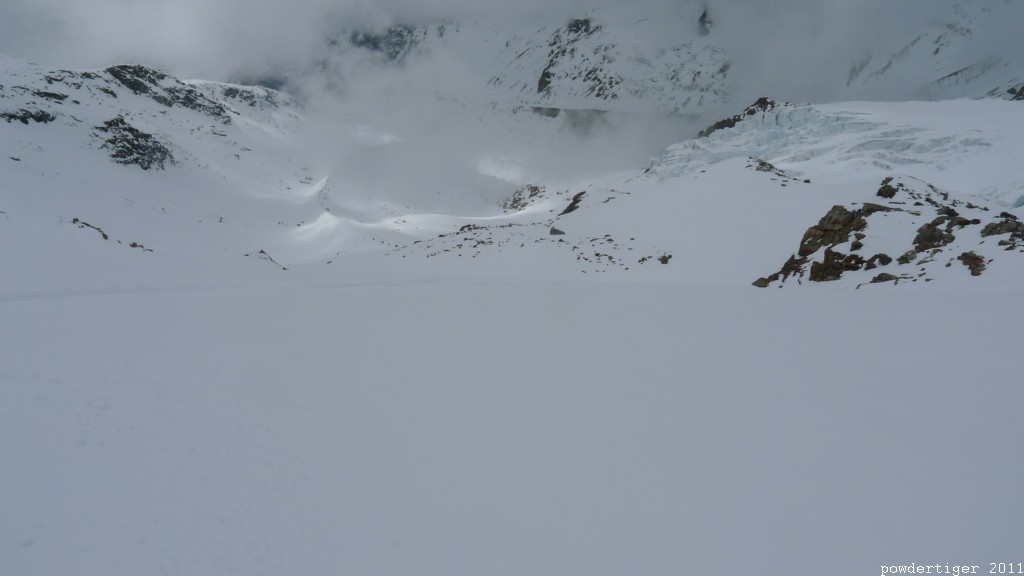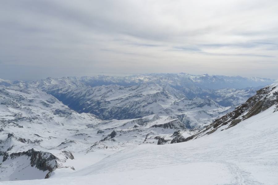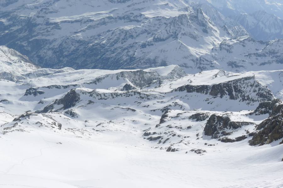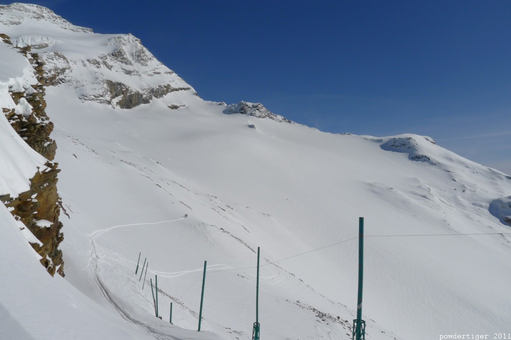 Nach dem gelungenen Anfang bin ich als nächstes zur Bettaforca, wo ich ob des brauchbaren Wetters gleich die Felle herausgeholt habe und Richtung Bettolina gegangen bin. Da alles gepasst hatte bin ich noch ein bischen weiter gegangen und Richtung St. Jacques abgefahren. Da dort wenige Spuren vorhanden waren, war die Abfahrt noch ne Ecke genussvoller als das Salza Tal. Ein paar cm frischer Schnee, westseitig noch trocken, auf glatter Firnunterlage waren doch ganz nett.