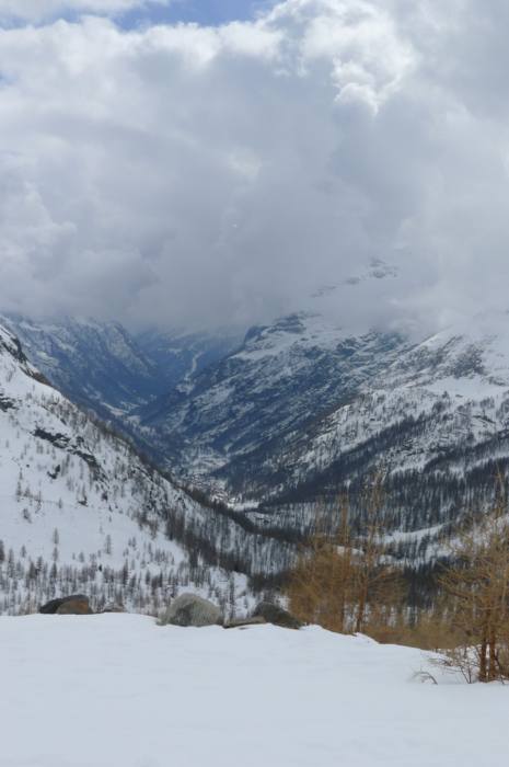 Hier der Blick auf Stafal, noch recht gut eingeschneit, weit besser als das Ayas-Tal. Leider war der Schnee schon etwas tiieef.