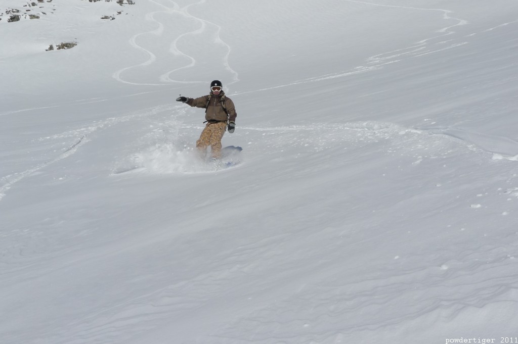 Am vierten Tag dann blauer Himmel und Neuschnee. Ein Höhepunkt des Urlaubs! Zwei Boarder aus dem Hotel und ich sind fast mit der ersten Bahn zum Indren hoch. Einige Freerider hatten schon den Weg zur Balma gespurt und wir hinterher.