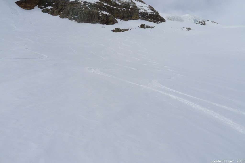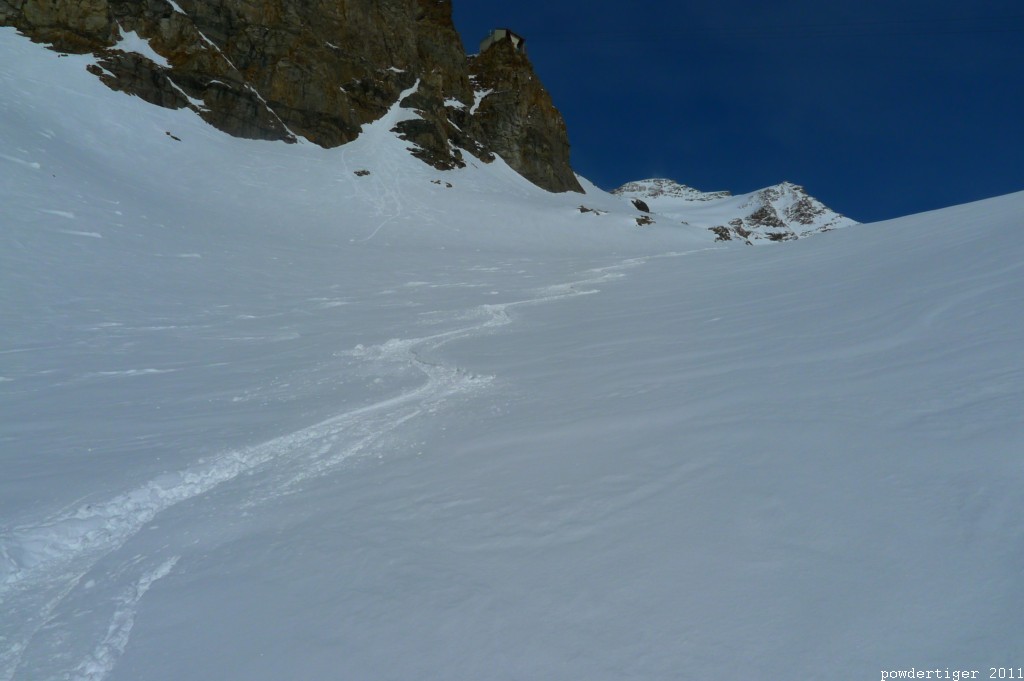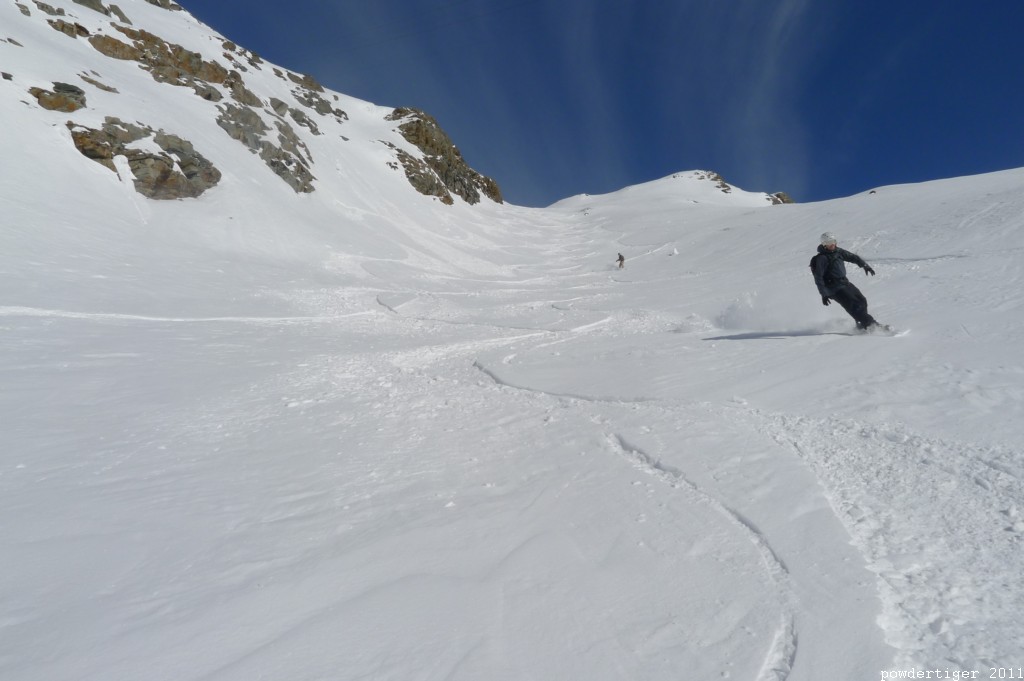 verbracht, den Nachmittag bei einem guten Essen auf der Guglielmina mit dem Freund und seiner Freundin. Sie hatten leider nur ein Bergfahrt gelöst und konnten dann bei den tollen Bedingungen am Nachmittag nurmehr ins Tal fahren. Einmal Stolemberg-Westseite war noch dabei, ich wollte sie nach langer Zeit mal wieder fahren, aber es war im oberen, steilen Abschnitt schon zu spät und kein Vergnügen.