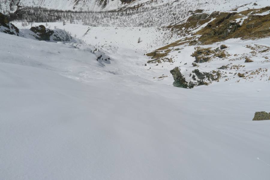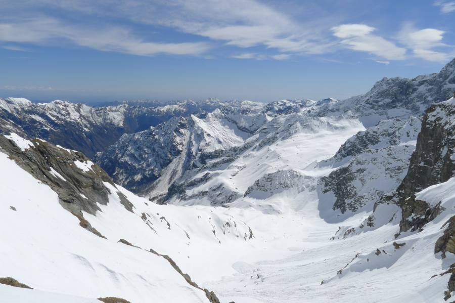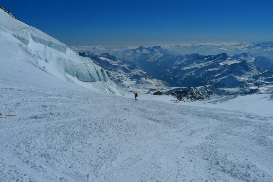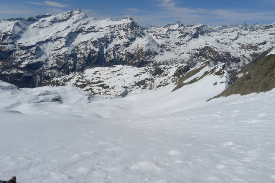 Am nächsten Tag – nach einer kühlen Nacht und blauem Himmel – gings morgens wieder hoch zur Bettaforca und weiter per Fellantrieb zur Bettolina. Die südostseitige Abfahrt war perfekt aufgefirnt und im oberen Teil ein Traum, weiter unten immer noch ganz brauchbar. Nach Transfer zum Indren wurde wieder von E-auf F-Antrieb weitergeschaltet, Belohnung der Mühen war etwas, was ich seit bestimmt 6 Jahren mangels ausreichend Schnee oder anderer Hindernisse nicht mehr gefahren war: Das verlorene Tal, Zufahrt über den Canale a Y und rein ins Vergnügen. Der Schneefall zwei Tage vorher war dort etwas kräftiger gewesen und hatte 5 cm Pulver hinterlassen. Auf ebenem Untergrund und in toller Landschaft ist sowas höchst vergnüglich.