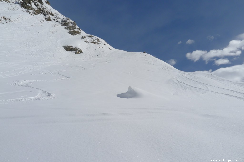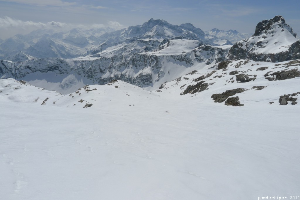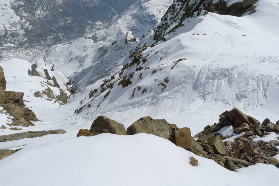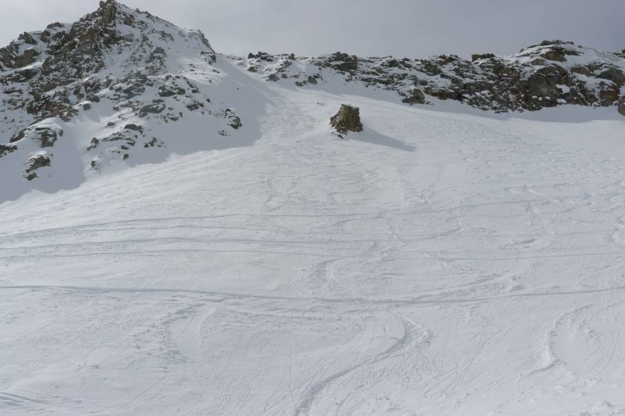 Am nächsten, dem fünften, Tag sind die beiden Boarder samt Gruppe vom Salati aus mit mir die paar Meter aufgestiegen und ebenfalls zur Balma runter gefahren. Danach – ohne die Boarder– bin ich dann vom Salati direkt zur Balma runter. Der Einstieg war allerdings noch steiniger als sonst und so war zurückschalten auf den P-Antrieb und Ski tragen angesagt; die meisten Vorgänger hatten es im Interesse ihrer Ski auch so gehalten. Dabei ist mir dann ein Stock seitlich weggerutscht und ich durfte ihn dort per pedes wieder einfangen. Danach war die Abfahrt aber ganz ordentlich.