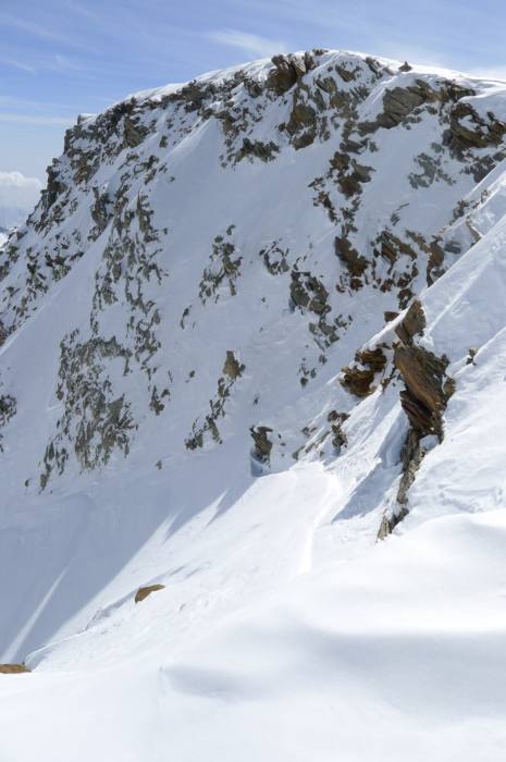 Die erste Bergfahrt führte mich ins Zentrum des Geschehens, auf die Punta Indren. Von da aus gings gleich weiter ins Salza Tal, das bei geringer Pulverschneeauflage ganz ordentlich zu fahren war, ein passender Urlaubsanfang und ein prima Appetithappen. Der Einstieg war wesentlich besser als letztes Jahr, als einige Felsen den Zugang etwas mühsam gestaltet hatten. Nicht so dieses Mal, alles war gut eingeschneit. Die Einheimischen haben gesagt, dass es dieses Jahr weniger Wind hatte und sich so der Schnee gleichmäßiger gehalten hätte. Egal weshalb, die Schneelage in der Höhe war insgesamt befriedigend bis sehr gut und das war das was zählte.